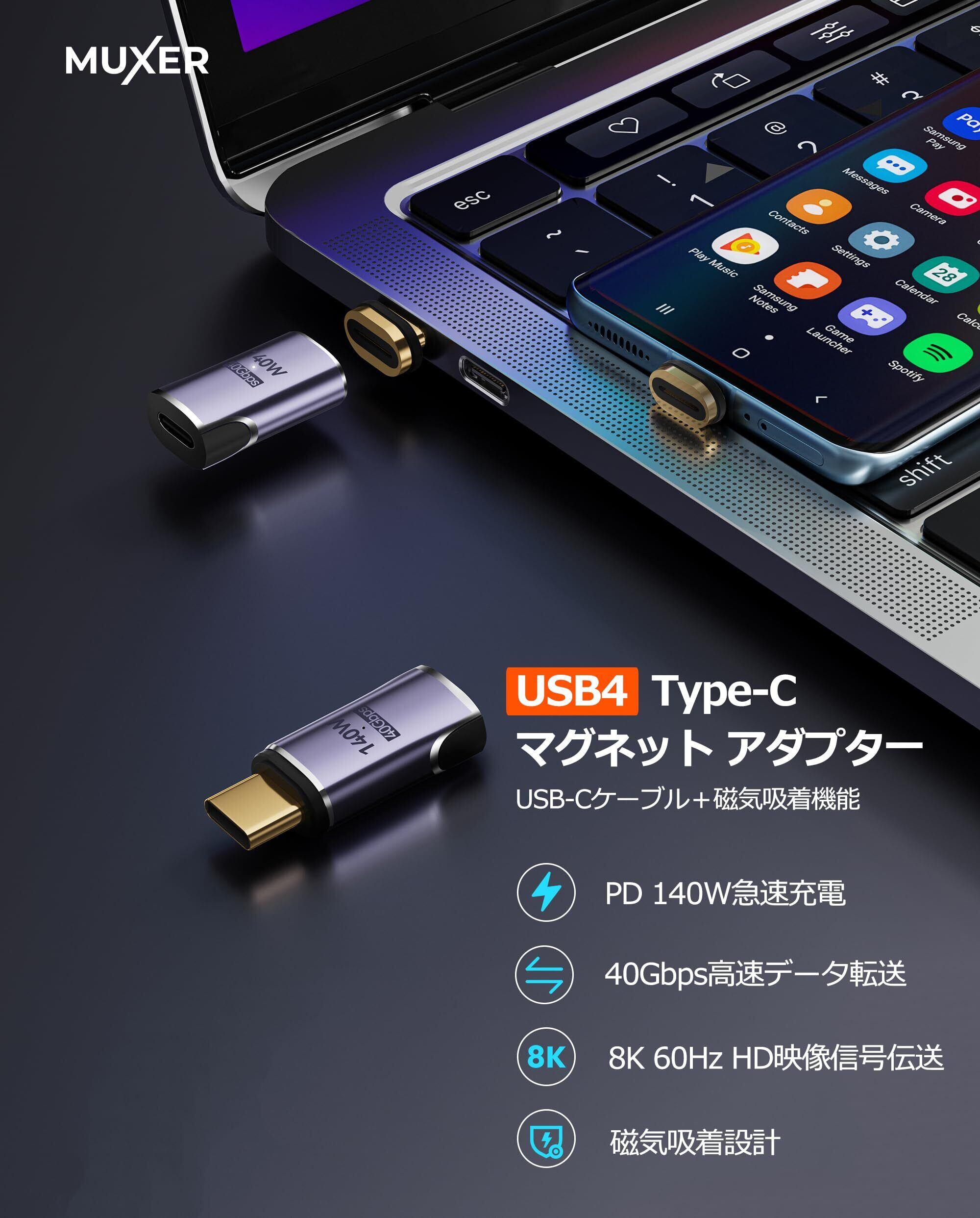 MUXER マグネット USB C 変換 アダプタ I字型【USB 3.1 40Gbps高速データ転送/140W PD急速充電/8K 60Hz HD映像信号伝送】 Type C 変換 アダプタ オス メス 変換 Thunderbolt 3 MacBook Pro/Airやその他Type-Cデバイスに対応 (140Wアダプタ2個)