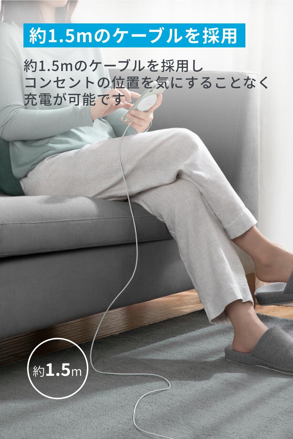 約1.5mのケーブルを採用:約1.5 mのケーブルを採用し、コンセントの位置を気にすることなく充電が可能です。
