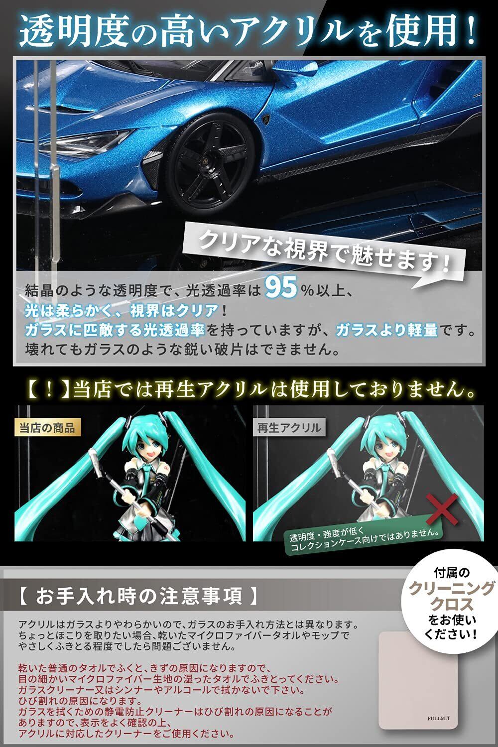 【選べるサイズ】フルミット フィギュアケース アクリル コレクションケース 高透明度 【UVカット】 透明収納ケース 組み立て 簡単 防汚れ 手袋 クリーニング クロス付き お手入れ方法 説明書 (縦30 x 横20 x 高20cm)