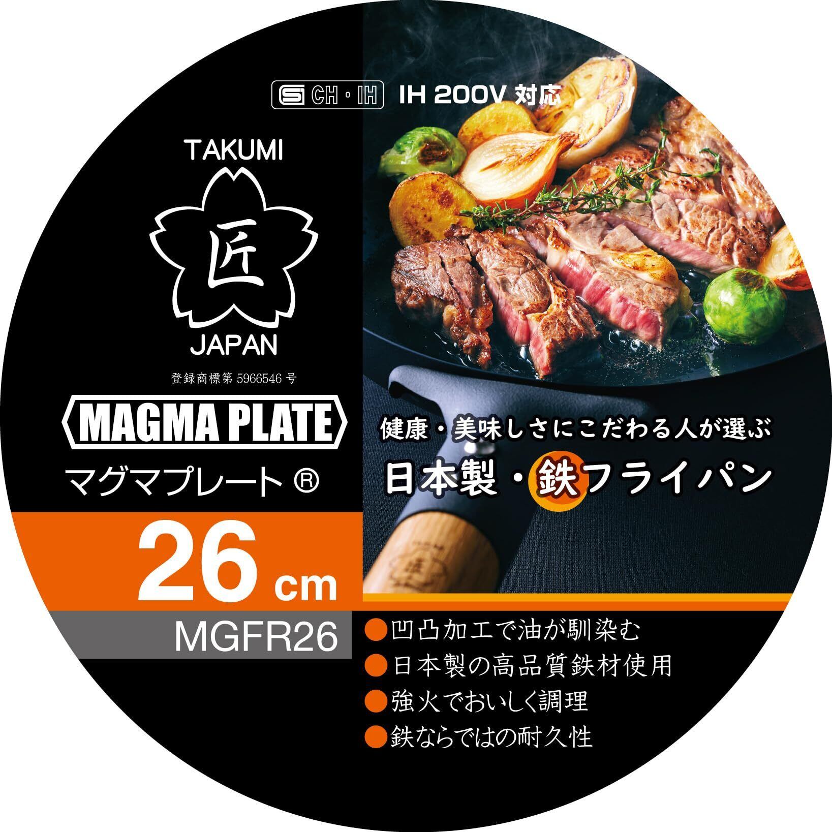 タクミジャパン(TakumiJAPAN)匠 タクミジャパン 鉄の表面に凹凸があるこびりつきにくいマグマプレート鉄フライパン IH対応 26㎝ 日本製 健康と美味しさにこだわる人が選ぶ鉄フライパン 熱伝導が早く、鉄分もつきやすい 日本製の鉄材も使用 強火で炒める事ができるので野菜もシャキシャキで料理可能 鉄フライパン 鉄鍋