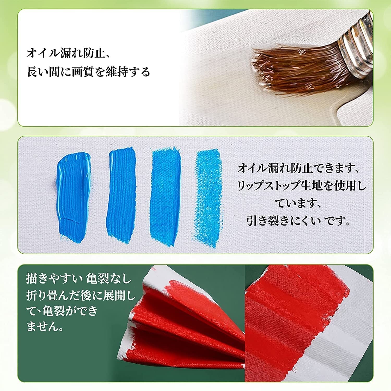 描きやすい:画布は綿化繊混紡の高品質素材を使って、中目のキャンバスです。麻に比べキャンバスの目が均一できれいです。色乗りがよく、描きやすいです。さまざまな絵具に対する吸収性にすぐれ、塗料が漏れにくいです。半吸収性の特性で、油絵だけでなく、アクリル絵の具にも使用できます。