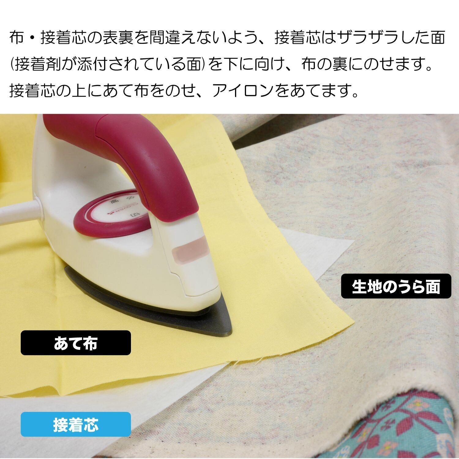 ・布・接着芯の表裏を間違えないよう、接着芯はザラザラした面(接着剤が添付されている面)を下に向け、布の裏にのせます。