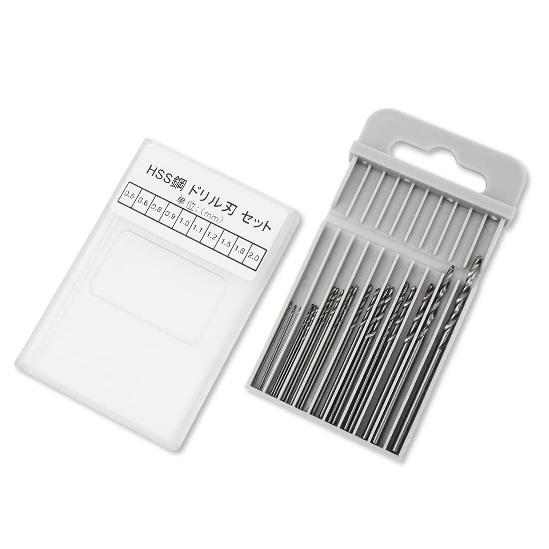 ドリル刃のサイズ:0.5mm×3本、0.6mm×3本、0.8mm×3本、0.9mm×2本、1.0mm×2本、1.1mm×2本、1.2mm×2本、1.5mm×1本、1.8mm×1本、2.0mm×1本。