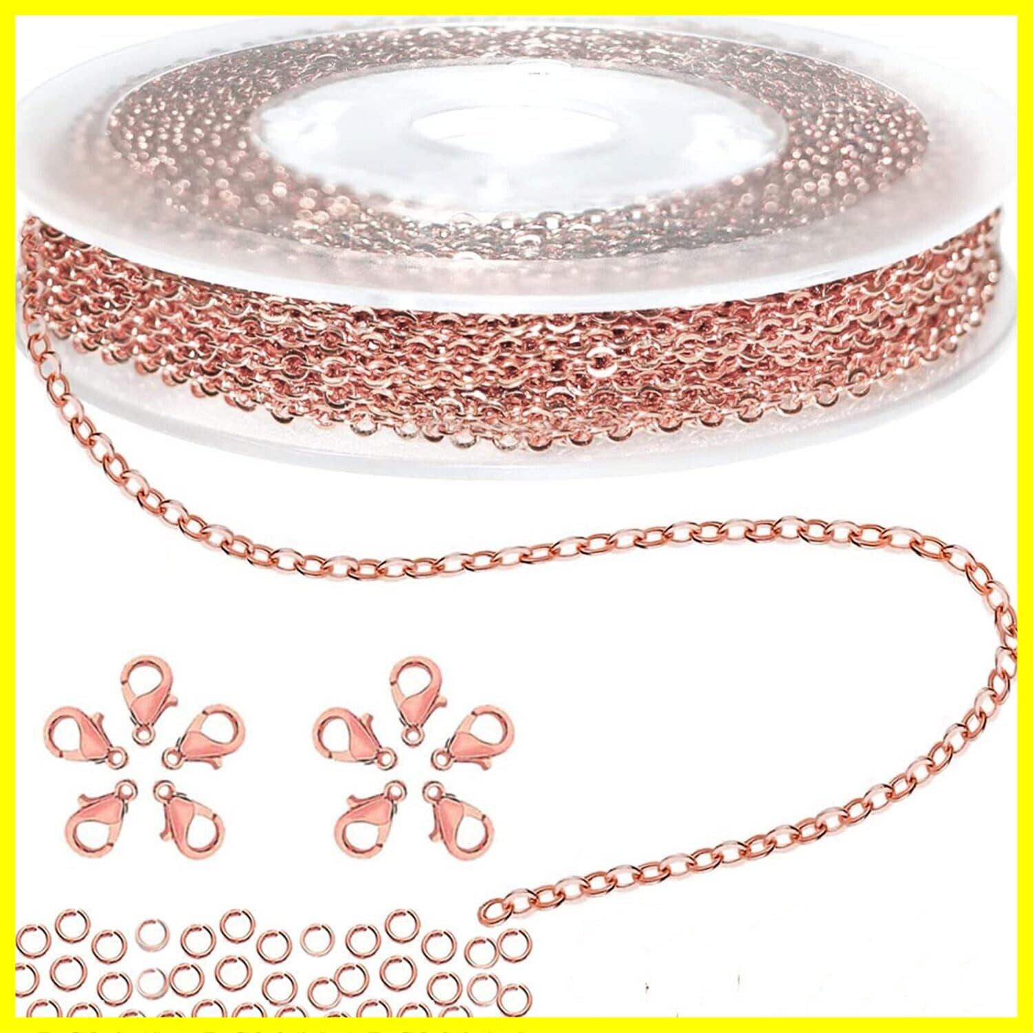 チェーン アクセサリー用チェーン 長さ約5メートル 幅1.5mm ジュエリーチェーン 小豆タイプ リングチェーン ジュエリー用 クラフト手作り用品 DIY用 ハンドメイド アクセサリーパーツ 基礎パーツ ロブスター・クラスプ10個とジャンプ・リング30個付き (薔薇金)
