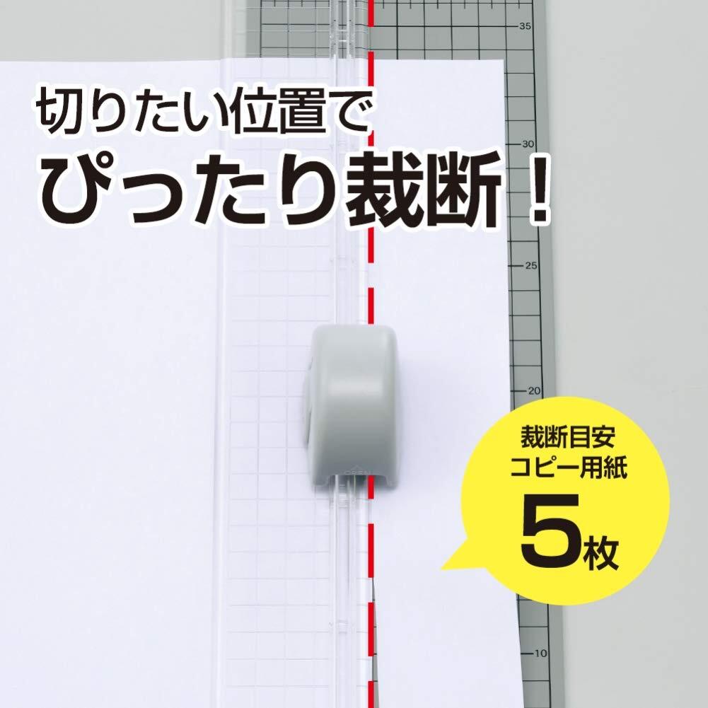 セーフティロック付きで安全、簡単に用紙を裁断できる簡易スライドカッター。