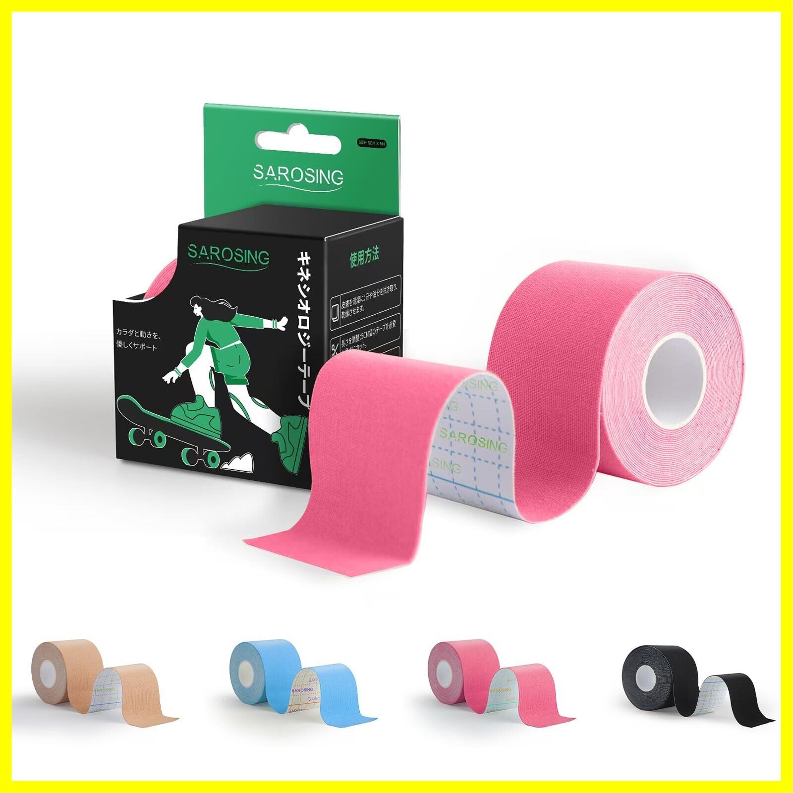 SAROSING キネシオロジーテープ 伸縮タイプ 50mm×5m|防水加工・低刺激粘着剤|スポーツ用テーピングテープ 膝・腰・手首サポート|通気性メッシュ構造で長時間快適