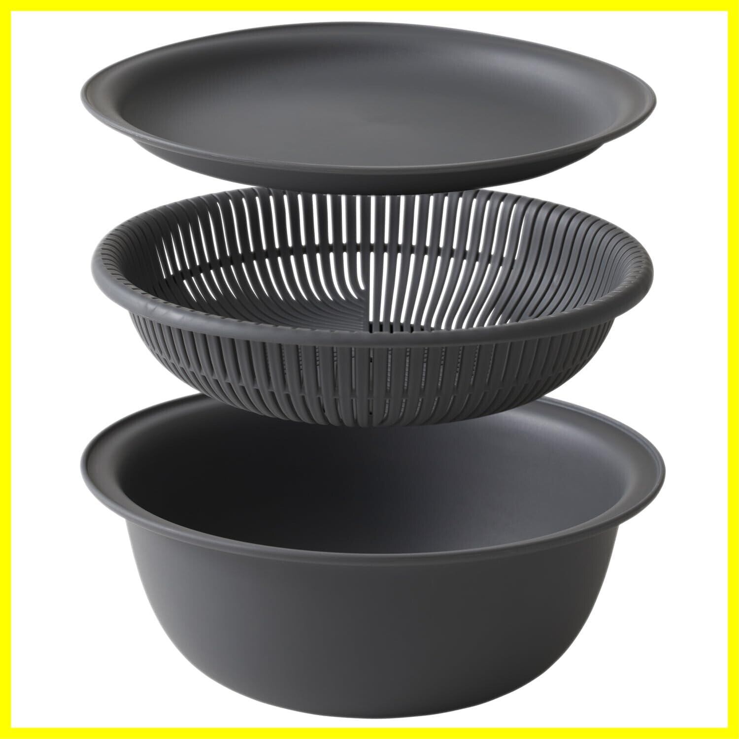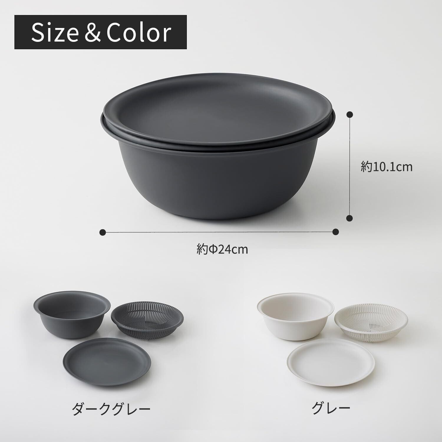 【深さが違うザルボウルセット】フタとして使えるトレーが付いた、 ザルボウルのセット。深さが違うため、 重ねて使えてキッチン台のスペースが広がります。