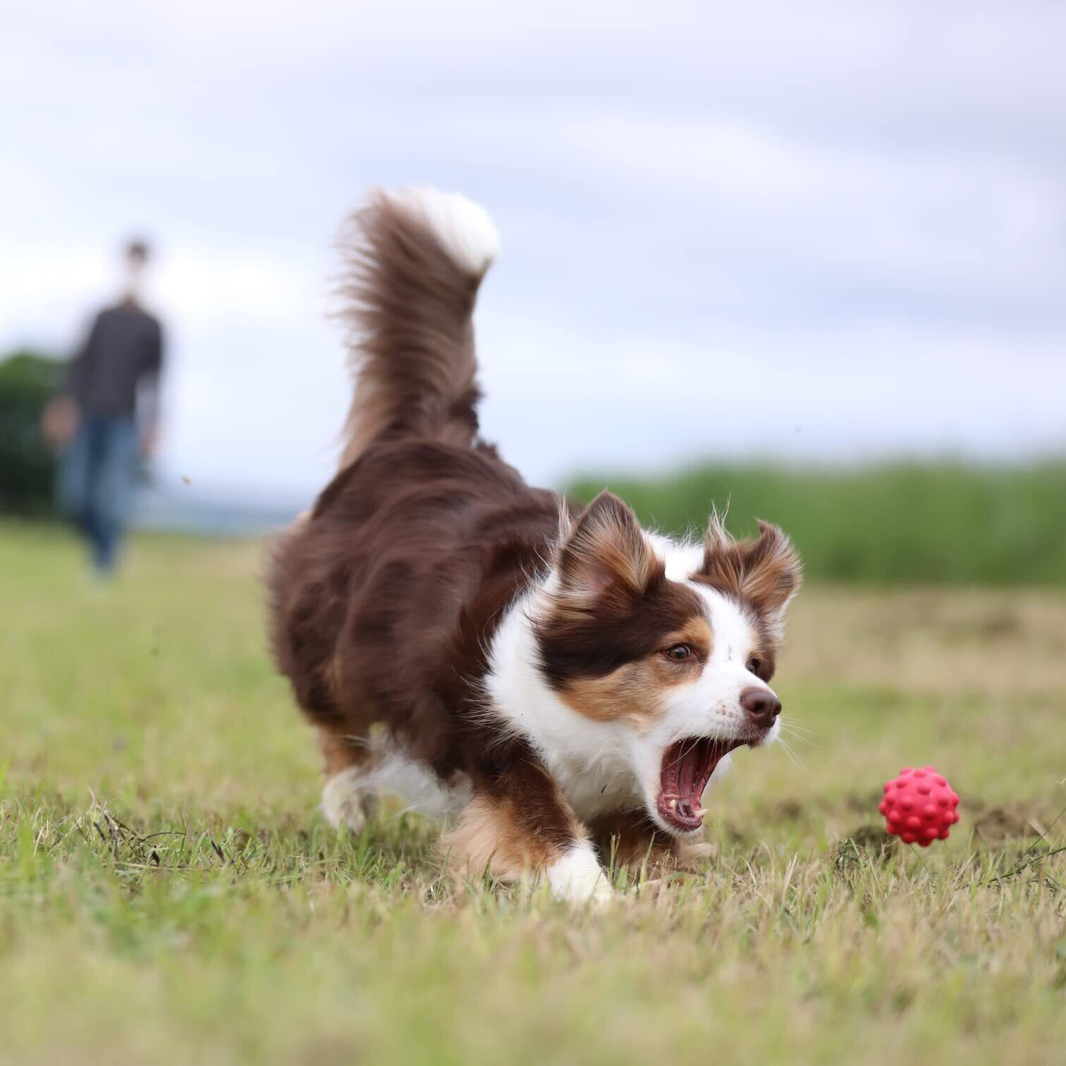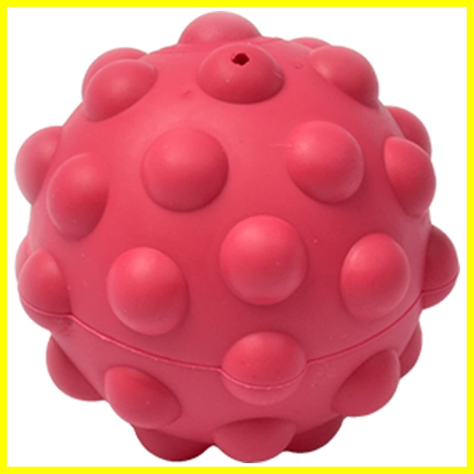 ナチュラルラバー100%の丈夫なボール。表面のデコボコとラバー特有の弾力により、不規則に飛び跳ねます。愛犬の興味を引くスクイーカー付き。