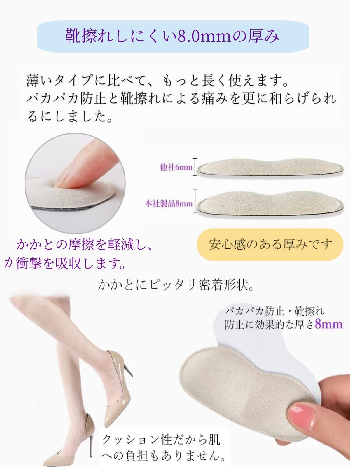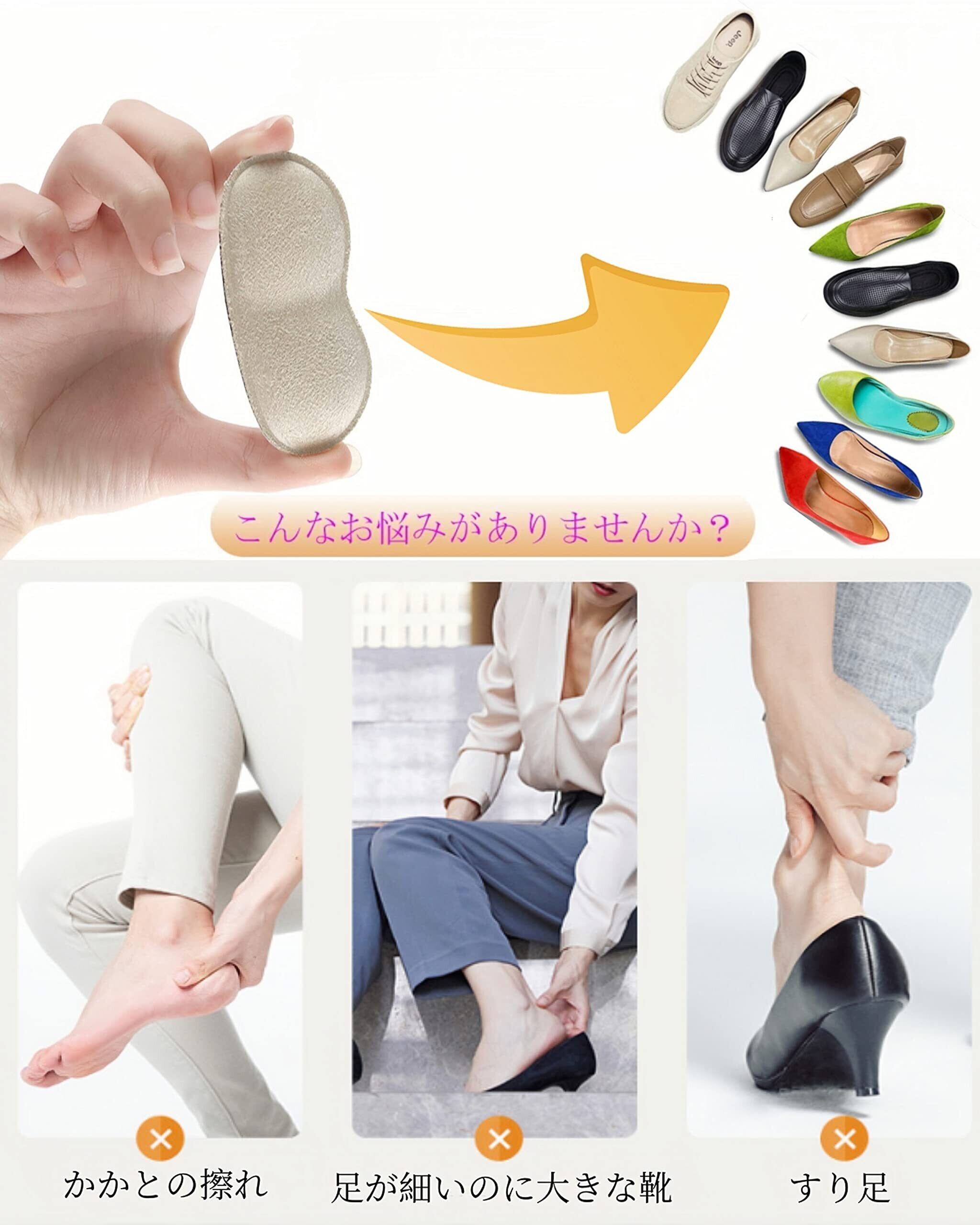 【かかとの保護】柔らかなクッション素材により、靴とかかとのブレを大幅に軽減し、歩行時の衝撃を和らげます。長時間使用しても変形しにくく、滑り止め効果も極めて優れており、パカパカでサイズが大きめの靴にも適用でき、かかとの位置をしっかりと固定して脱げないようにします。購入したばかりのパンプス、履き慣れない革靴、サイズが合わない靴などに使用でき、痛みを我慢せずに快適に歩けます。