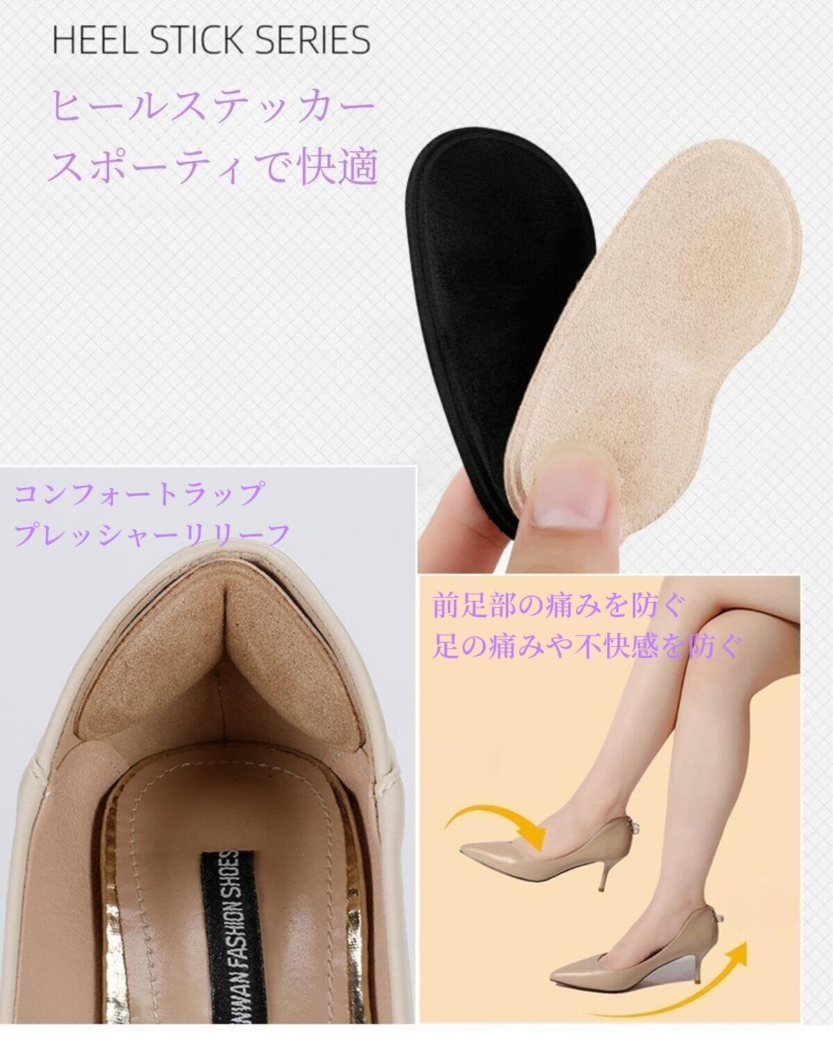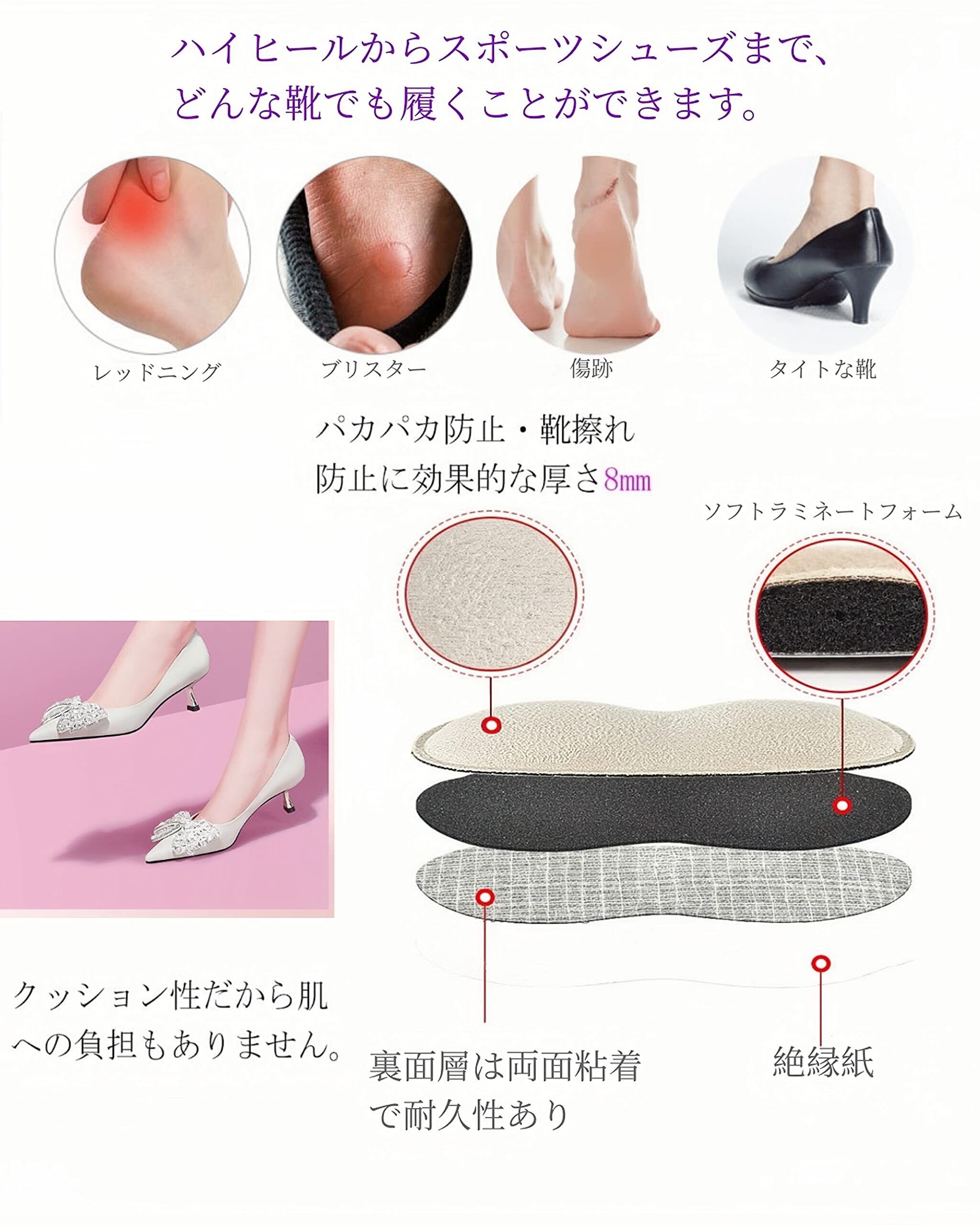 【様々な靴に対応可能】シンプルなデザインで、どのような靴に装着しても目立たなく、違和感がありません。ヒールクッションパッドは、ハイヒールだけでなく、パンプス、シューズ、ビジネスシューズ、サンダル、スニーカーなど、様々な靴に使用できます。※内部が起毛しているシューズやブーツでの使用はお勧めしません。