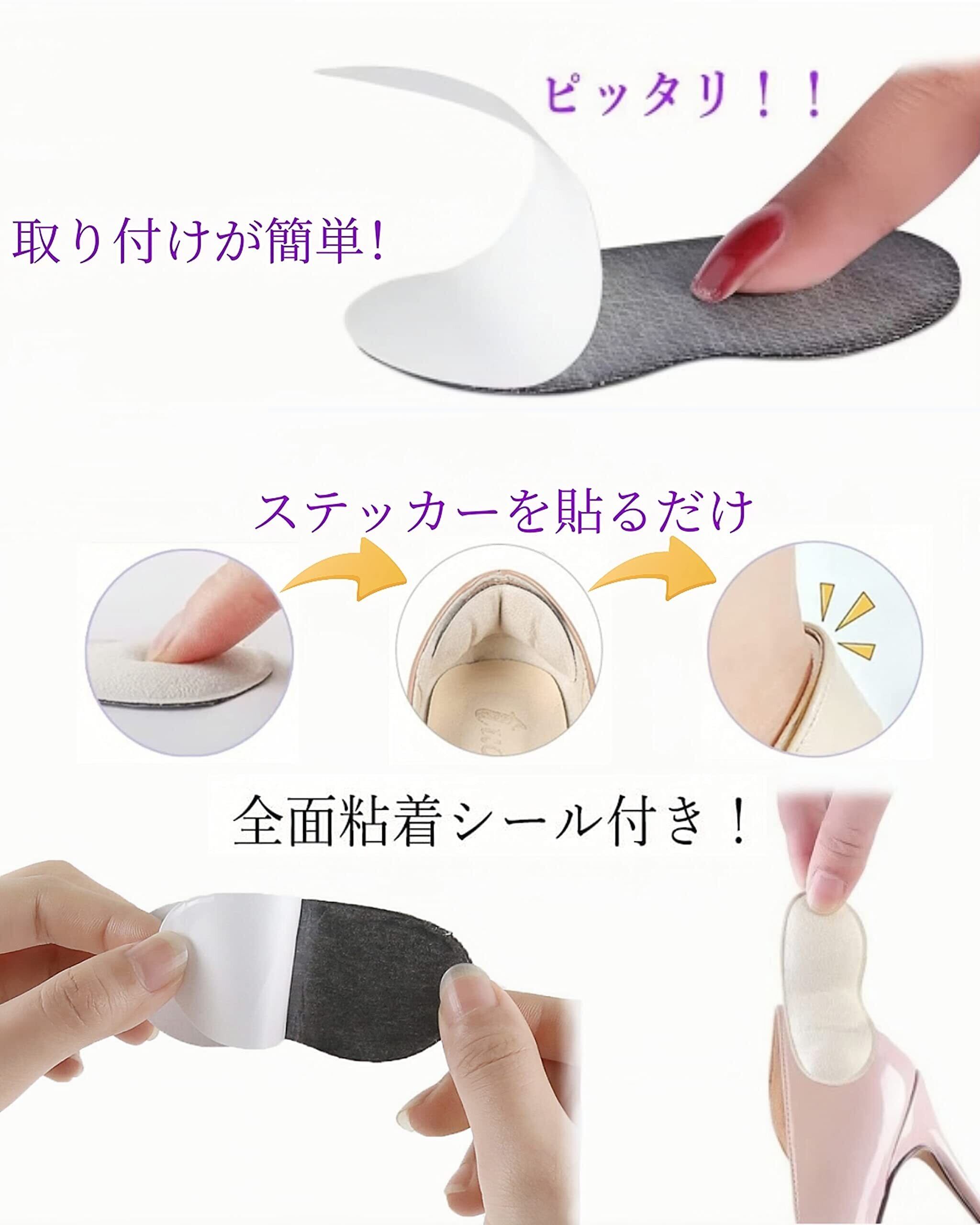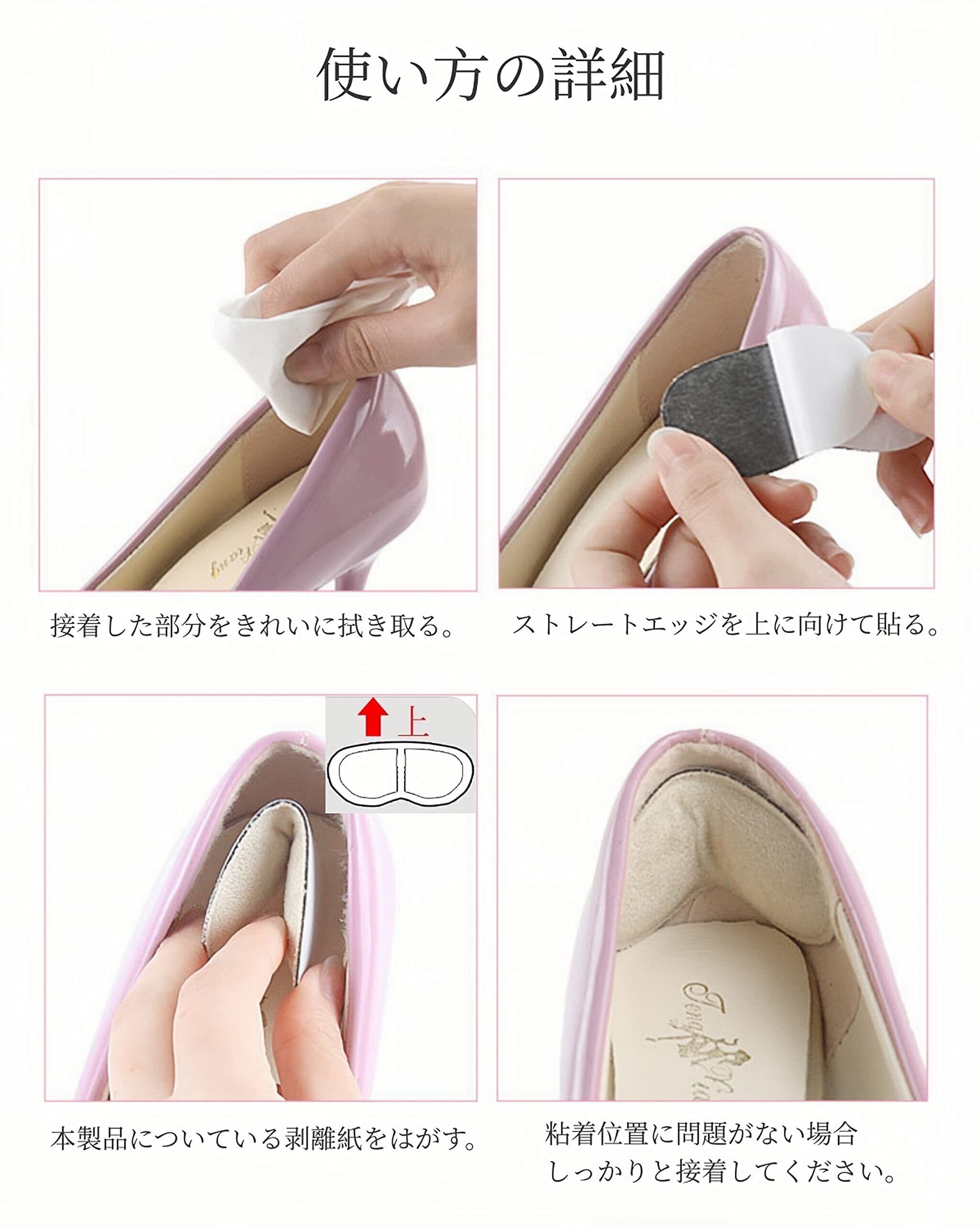 【使いやすくて滑り止め】靴ずれパッドの裏面には粘着性の強いステッカーが付いており、裏紙を剥がしてきれいに拭いた靴に貼り付けるだけで簡単に装着できます。粘着性が強いので、かかと部分に貼ったら滑り落ちる心配はありません。使い方は非常に簡単で、初心者でも手軽に利用できます。