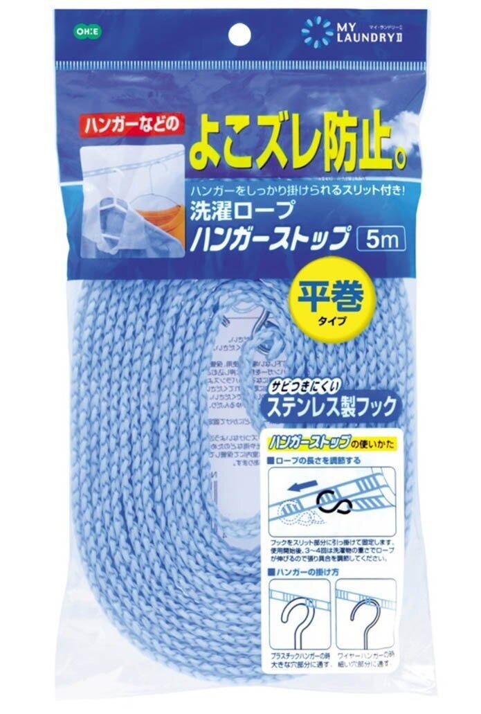 オーエ 洗濯 物干し ロープ ブルー 約5m ハンガーを掛けられるスリット付 ハンガー ストップ
