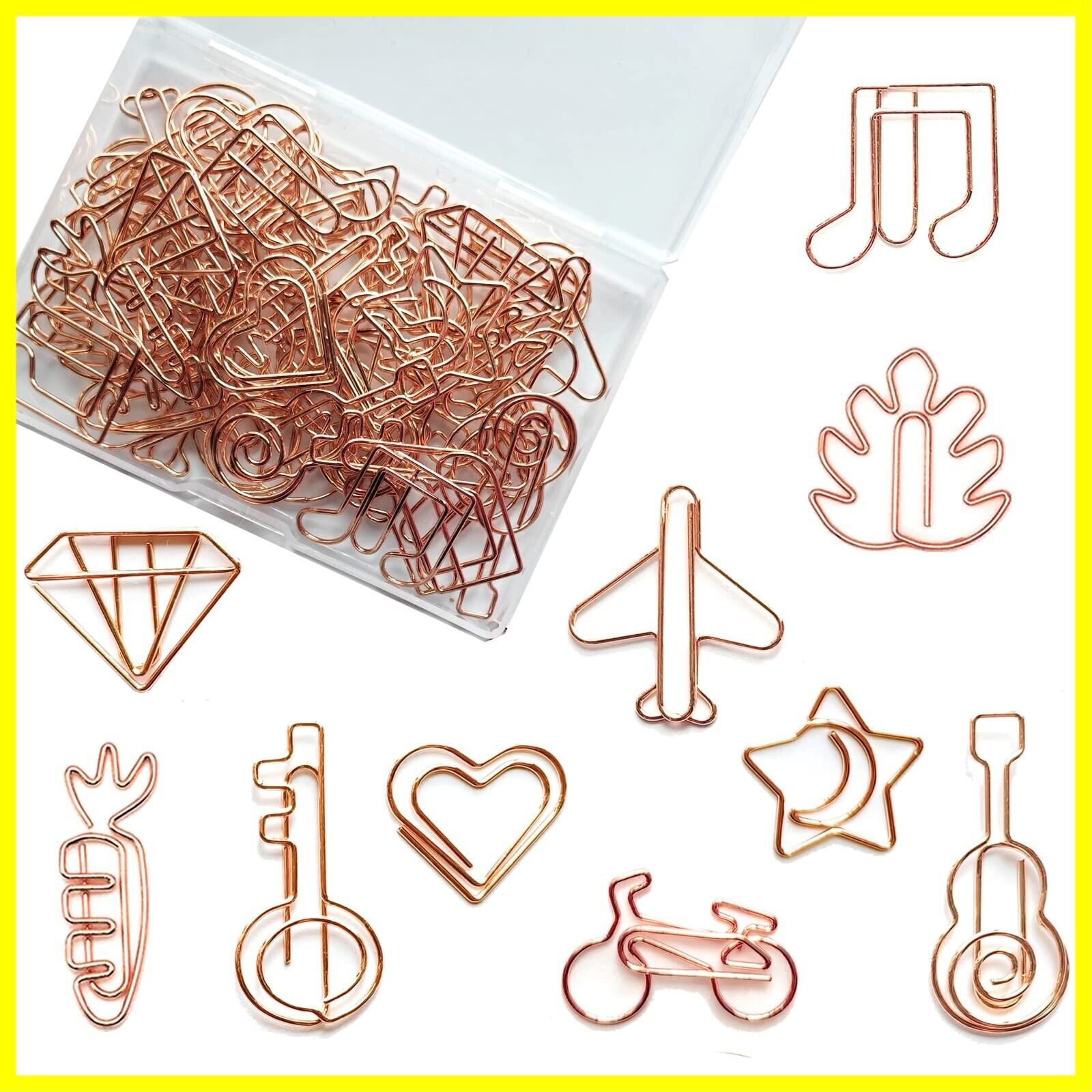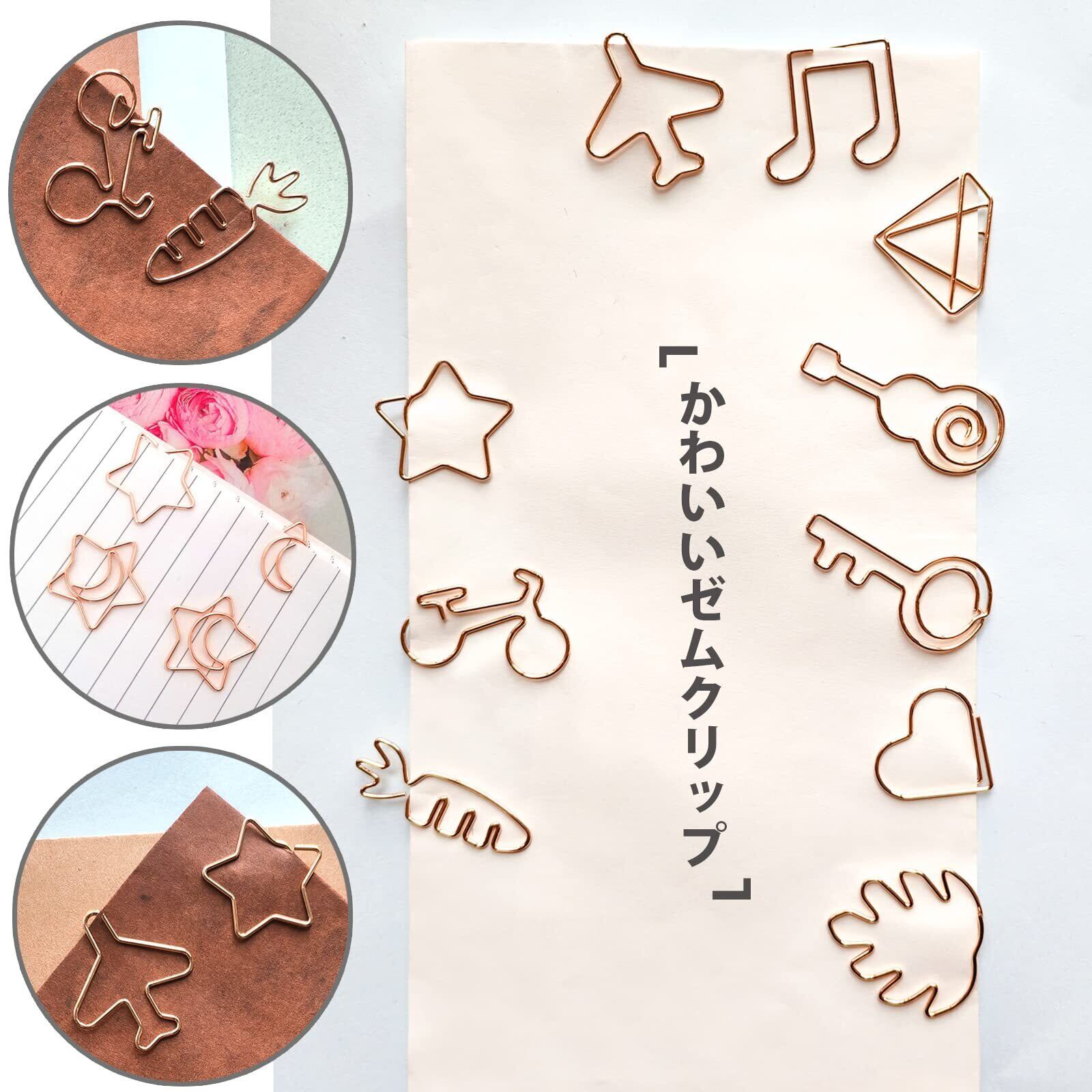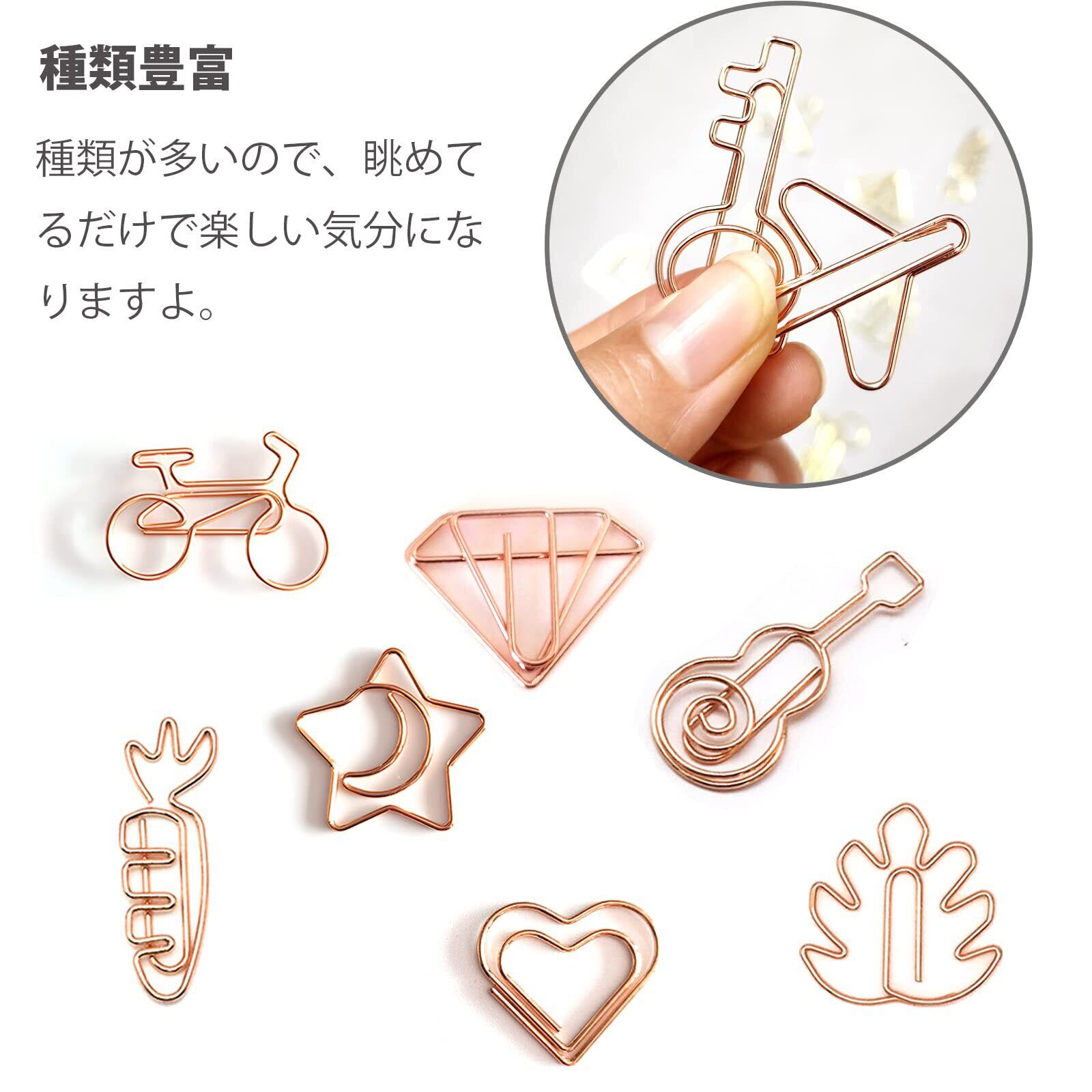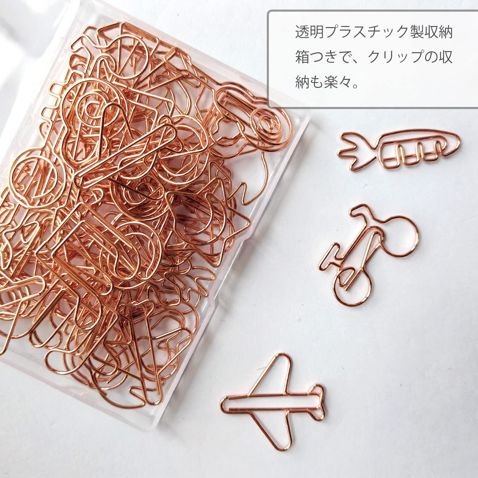 【製品仕様】●セット内容:ペーパークリップ50個入り(10種類各5個)、収納ケース付き;●10種類:ギター、ハート、月星、自転車、葉、鍵、音符 、人参、ダイヤ、飛行機;●サイズ:寸法図を参照してください;●素材:金属+電気メッキ;●線径:約1mm;●色:ピンクゴールド