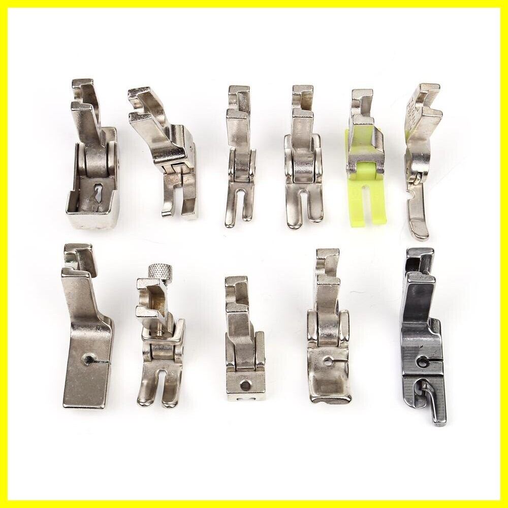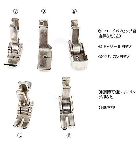 ①基本押さえ ②テフロン押さえ ③左端縫い/自由押さえ ④コンシール/ファスナー押さえ ⑤コードバイキング/自由押さえ ⑥三巻押さえ ⑦ペリカン方型押さえ ⑧段付け押さえ(右) ⑨基本押さえ(細) ⑩ギャザー用押さえ ⑪調整可能/シャーリング押さえ