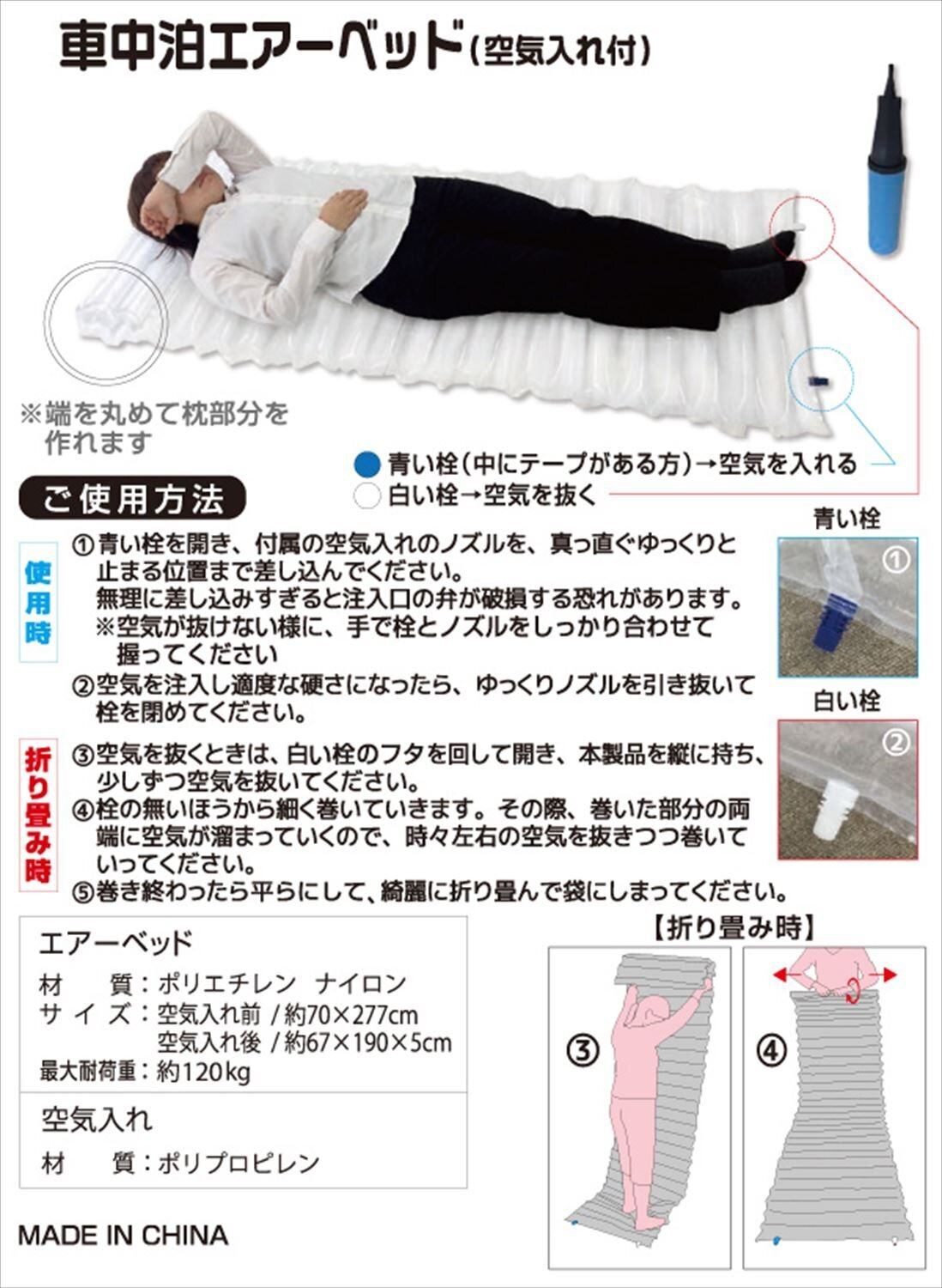 材質:エアマット=ポリエチレン・ナイロン、空気入れ=ポリプロプレン、ブルーシート=ポリエチレン