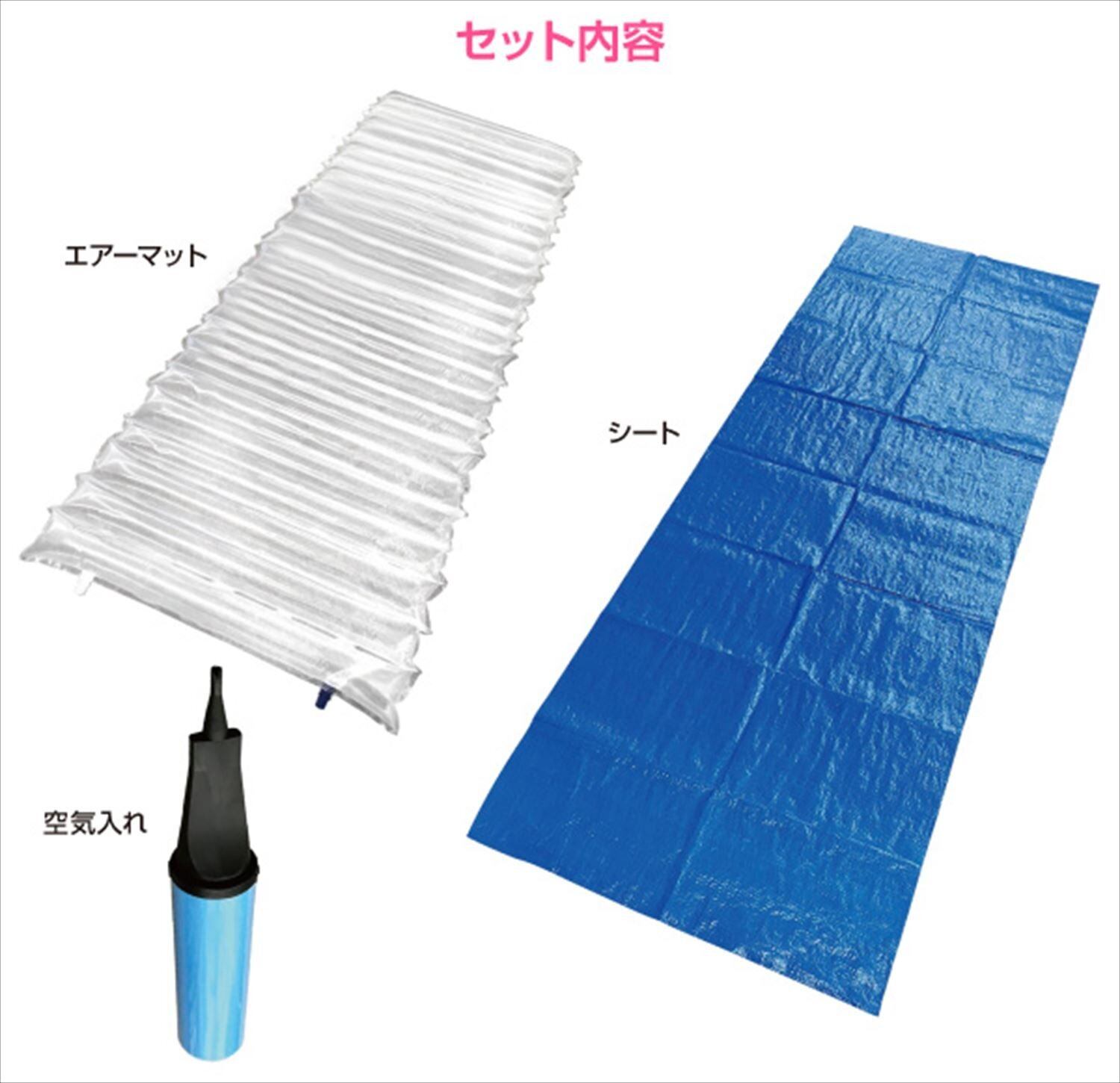本体サイズ:エアーマット=幅67×奥行190×高さ5cm、ブルーシート=たて200×よこ75cm、空気入れ=幅5×奥行5×高さ28cm