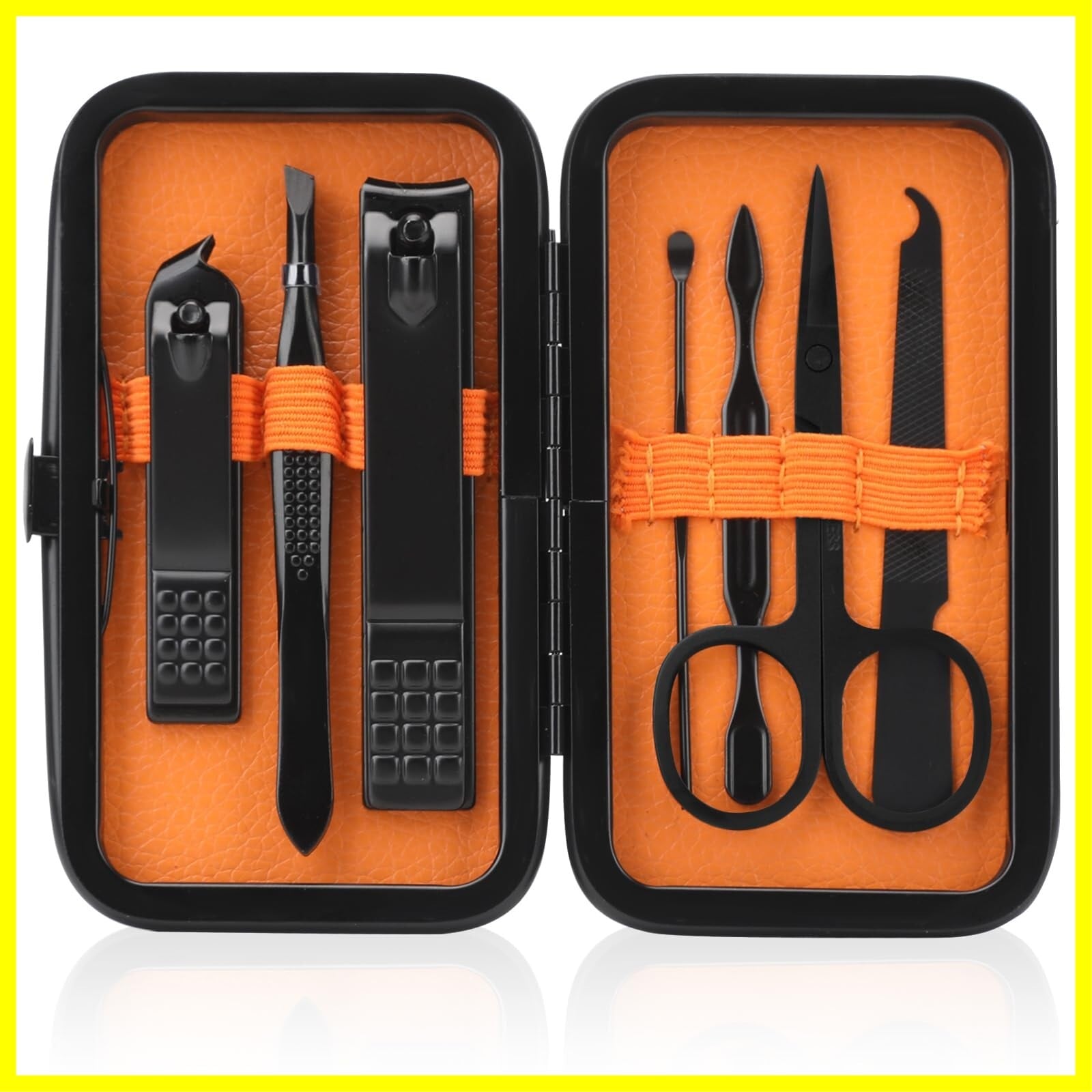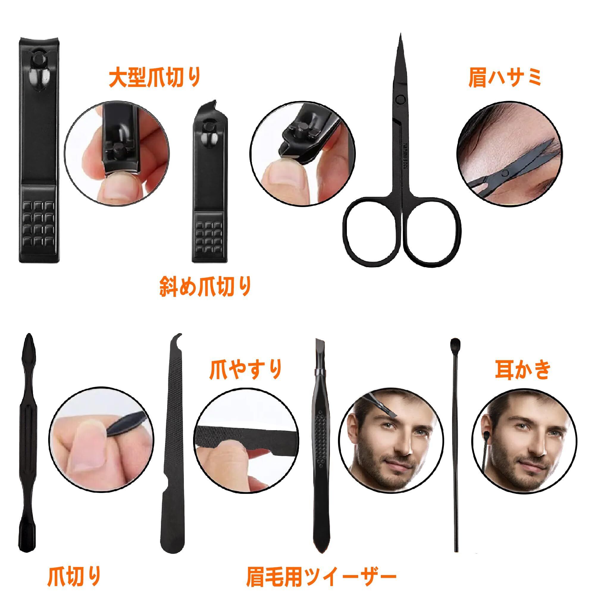 [メンズレディースマニキュアセット] ユニークな黒+オレンジの配色で、この爪切りセットは、男性と女性の両方に適しています。ハンドケア、フェイシャルケア、フットケアツール(大型爪切り、小型斜め爪切り、眉毛はさみ、眉毛ピンセット、耳かき、爪やすり、爪クリーナー、携帯用トラベルPUケース)を含む多機能トラベルマニキュアセット。