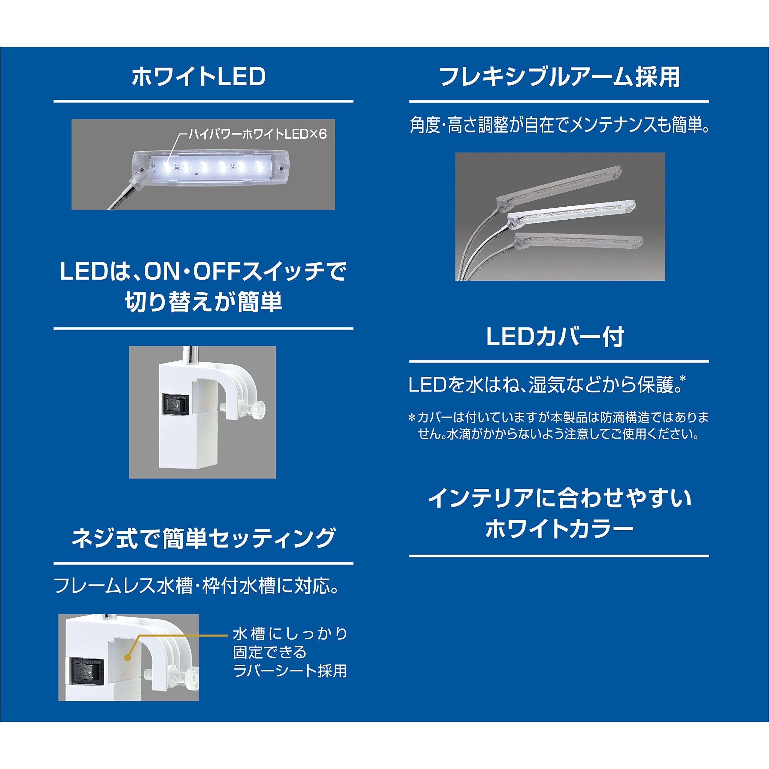 ハイパワー高輝度LED採用。明るく、鮮やかに。発光素子が3つ入ったハイパワーSMDLEDを使用。照射角度120度で水槽をすみずみまで明るく照らす。 魚や水草がきらめく白色光。 フレームレス水槽、枠付き水槽にも取り付け可能。ネジ式で簡単セッティング。LEDは、ON・OFFスイッチで切り替えが簡単。LEDを水はね、湿気などから保護するLEDカバー付き※カバーはついていますが、本製品は防滴構造ではありません。水滴がかからないよう注意してご使用ください。フレキシブルアームで角度・高さの調整が自由自在。メンテナンスも簡単に行えます。インテリアに合わせやすいホワイトカラー。