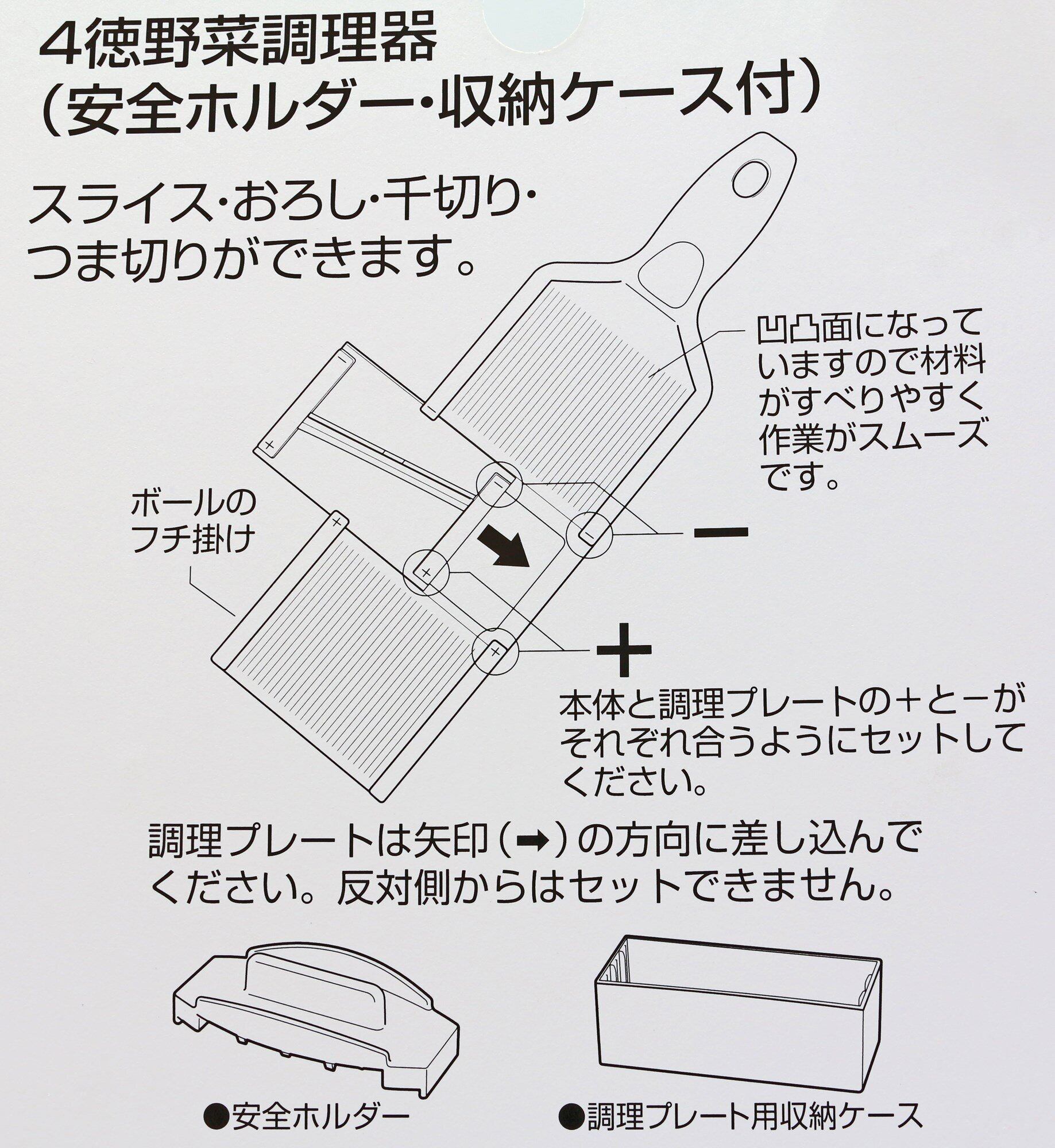材質:本体・プレート・安全ホルダー/ABS樹脂(耐熱温度80度)、ケース/ポリプロピレン(耐熱温度120度)、刃/ステンレス鋼