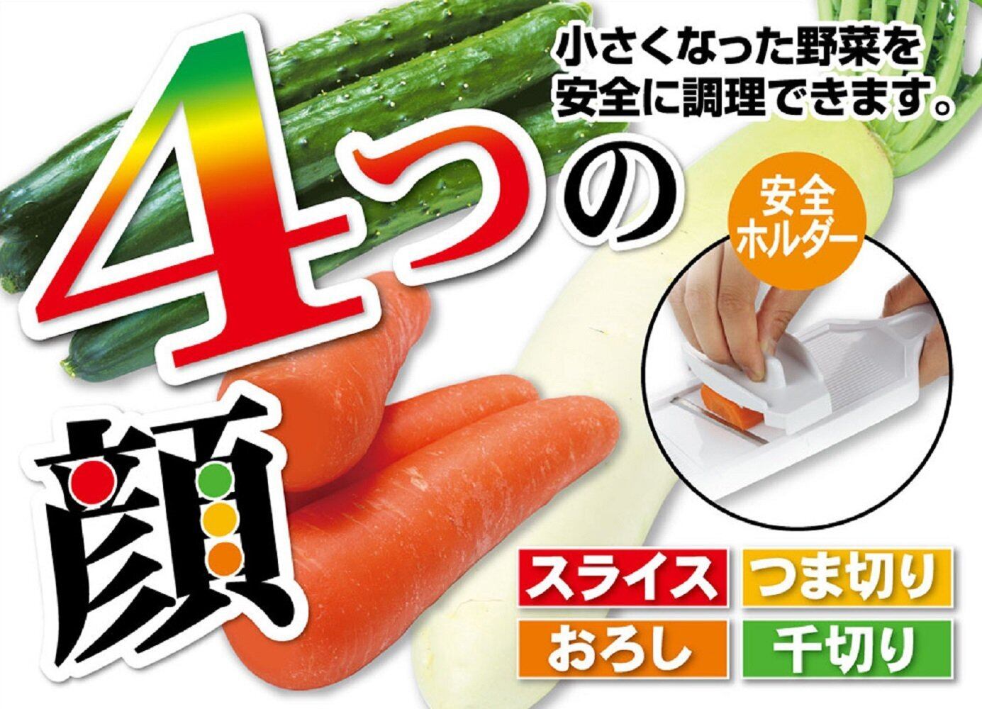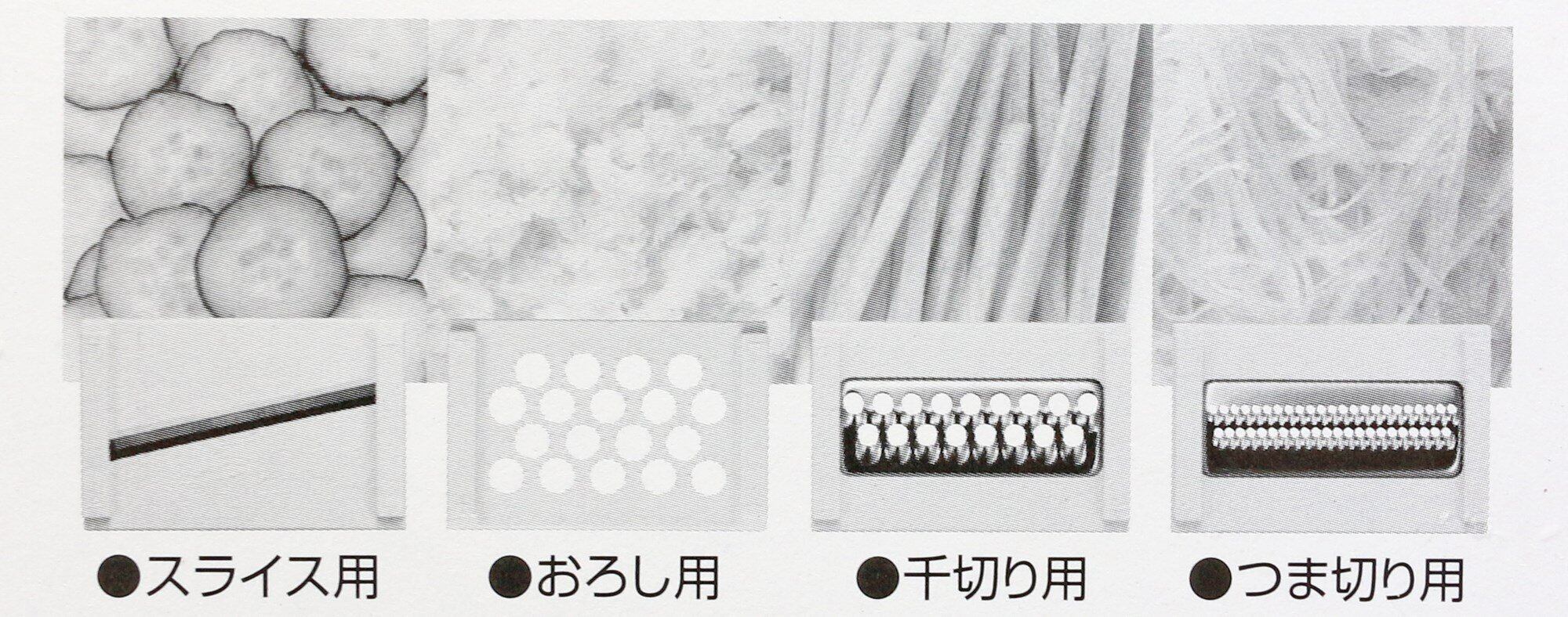 プレートを交換するだけで「スライス」「おろし」「千切り」「つま切り」ができる