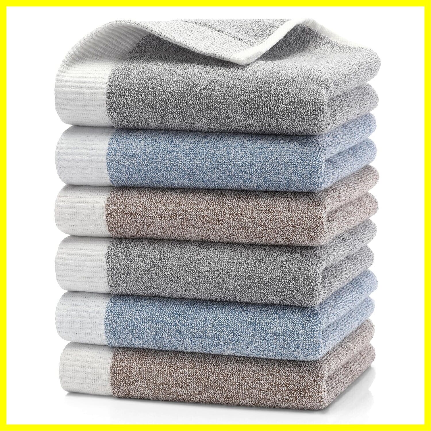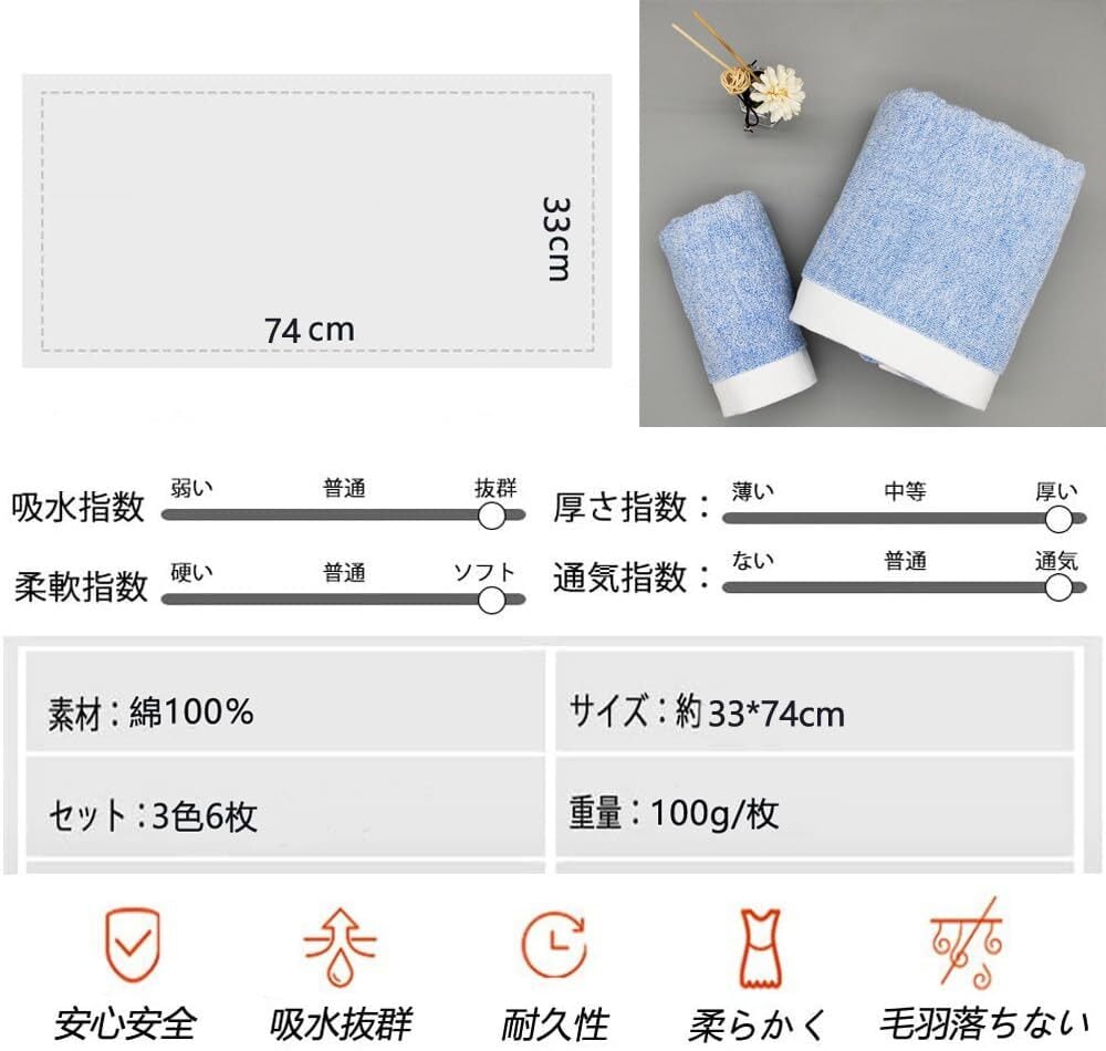 【フェイスタオル 6枚セット】素材:綿100%、サイズ:約33×74cm、重さ:約100g(1枚)、セット内容: グレー 2枚 + ブルー 2枚 + ブラウン2枚。