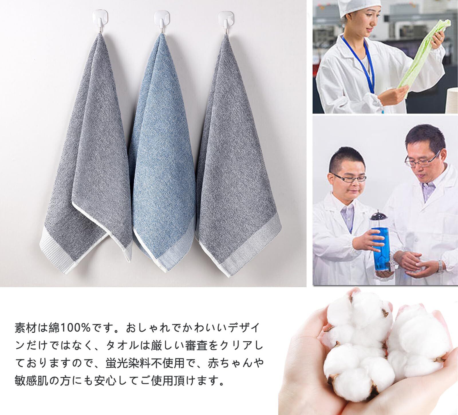 【厳選された綿100%の素材】素材は綿100%です。染色堅牢度は4級に達し、色移りや毛羽落ちがなく、何回洗濯しても変形しなくて、超長持ちタイプです。おしゃれでかわいいデザインだけではなく、タオルは厳しい審査をクリアしておりますので、においがありません、蛍光染料不使用で、赤ちゃんや敏感肌の方にも安心してご使用頂けます。