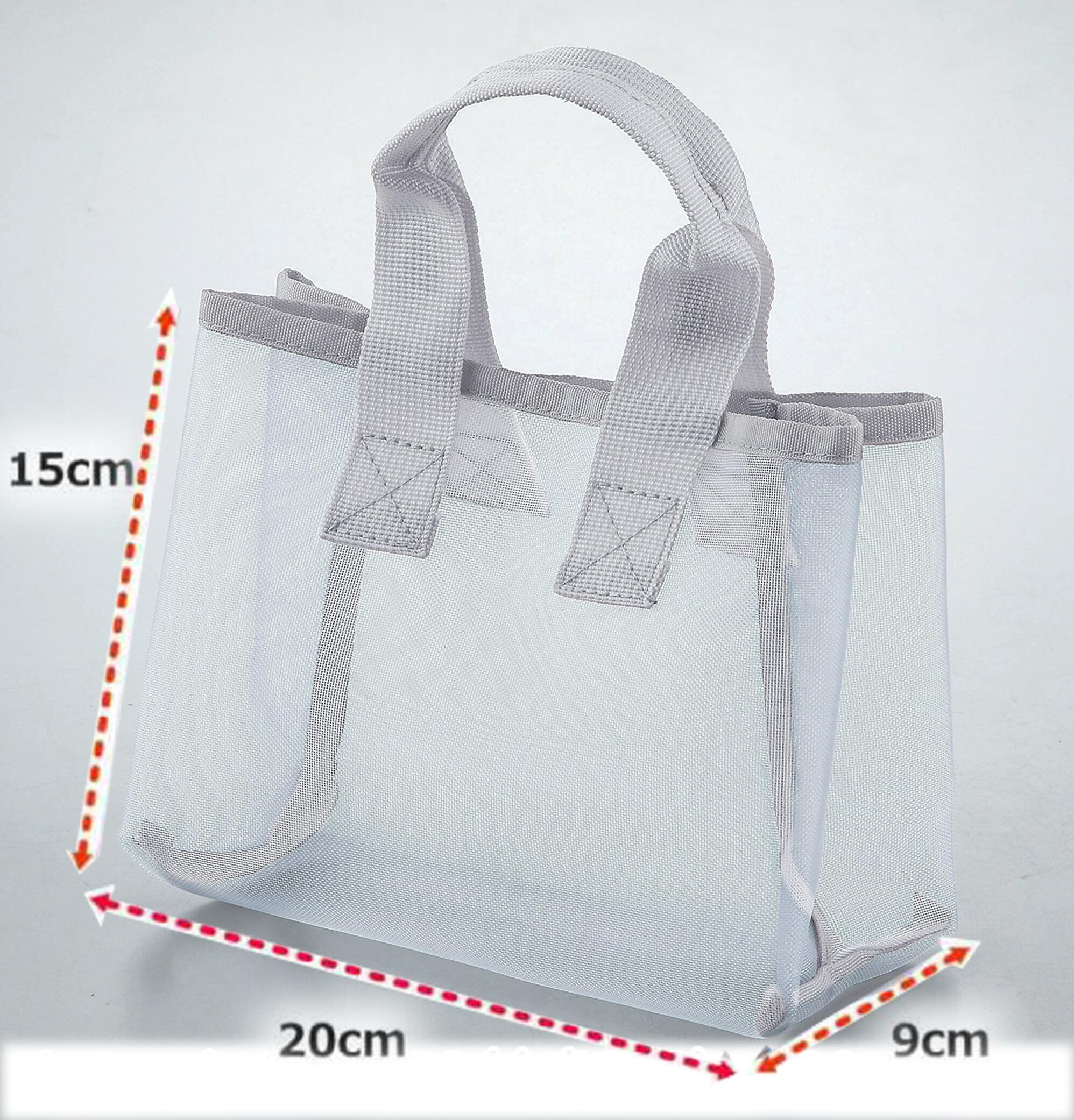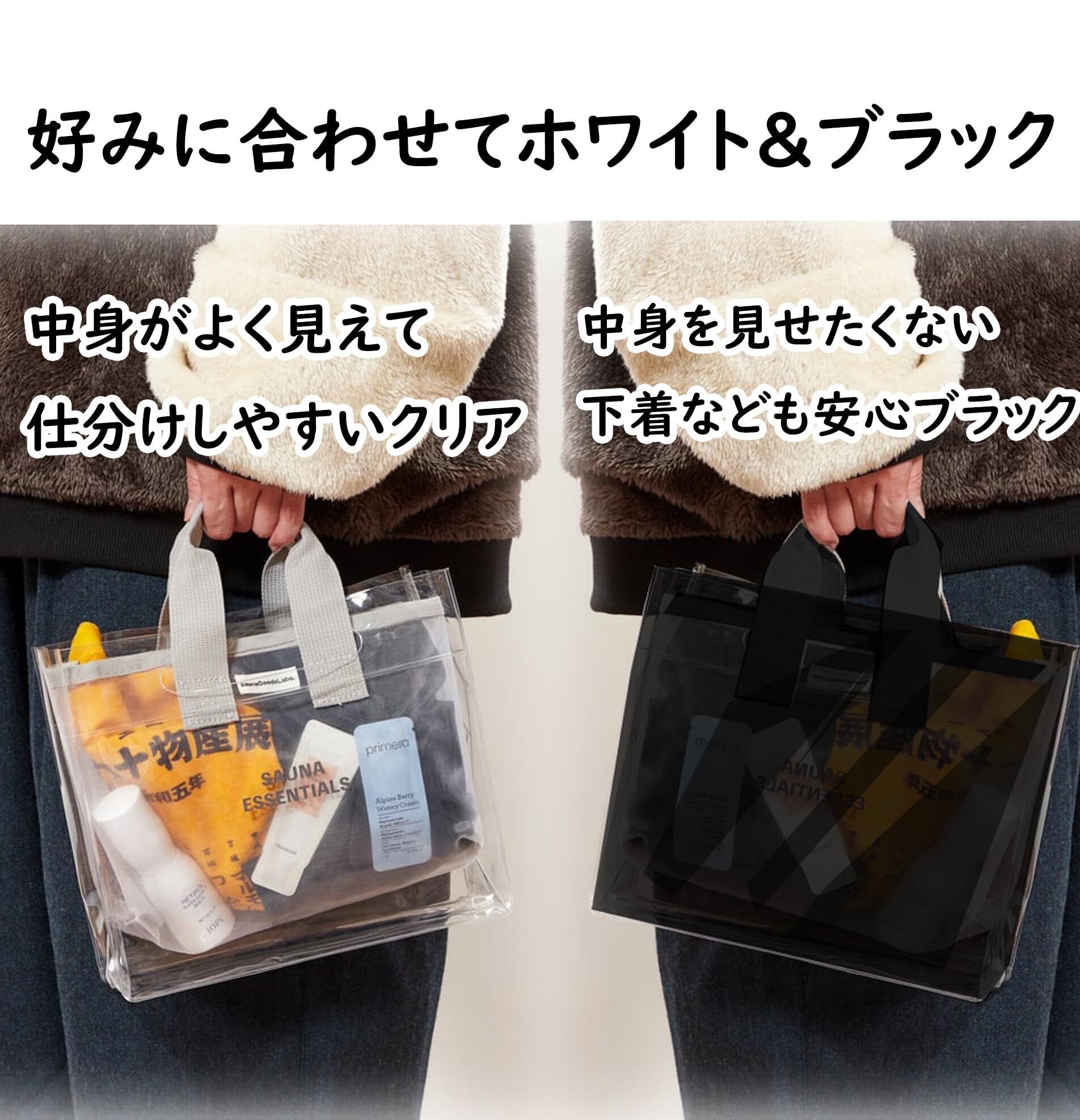 【使い方】入浴グッズ(シャンプー 洗顔 サウナハット カミソリ ボディータオル などなど)をメッシュバッグに入れて浴室へ→入浴後はそのままPVCバッグにイン→そのまま持ち帰れるから身の回り品が濡れない!マチ付きで、自立するから置き場に困らない。