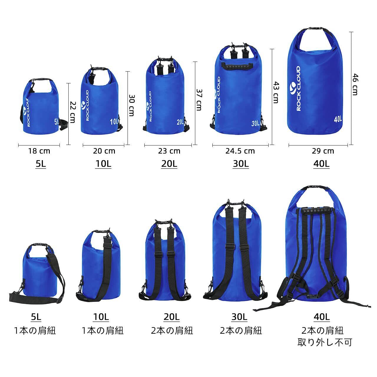 ROCK CLOUD ドライバッグ 防水バッグ ドラム型 防水ポーチ リュック 折りたたみ 軽量 5L 10L 20L 30L 40L アウトドア 海水浴 釣り ビーチ 水泳 登山 旅行用