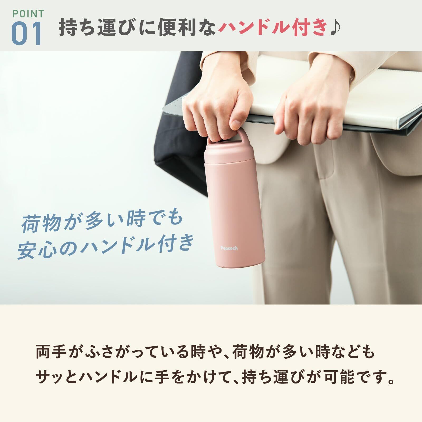 【持ち運び便利なハンドル付き】ピーコック魔法瓶 スクリューマグボトル ダスティピンク 350ml 水筒 魔法瓶 保温 保冷 まほうびん 持ち手 軽量 タンブラー コーヒー マグ 洗いやすい マグボトル AKZ-35 PD