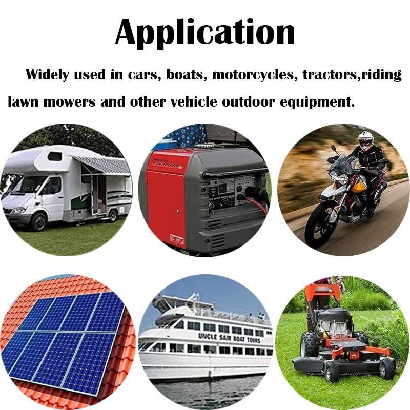 ◀用途:さまざまなバッテリー、オートバイ、スクーター、RV、ATV、乗用芝刈り機、ソーラーパネル、ボートなどに適しています