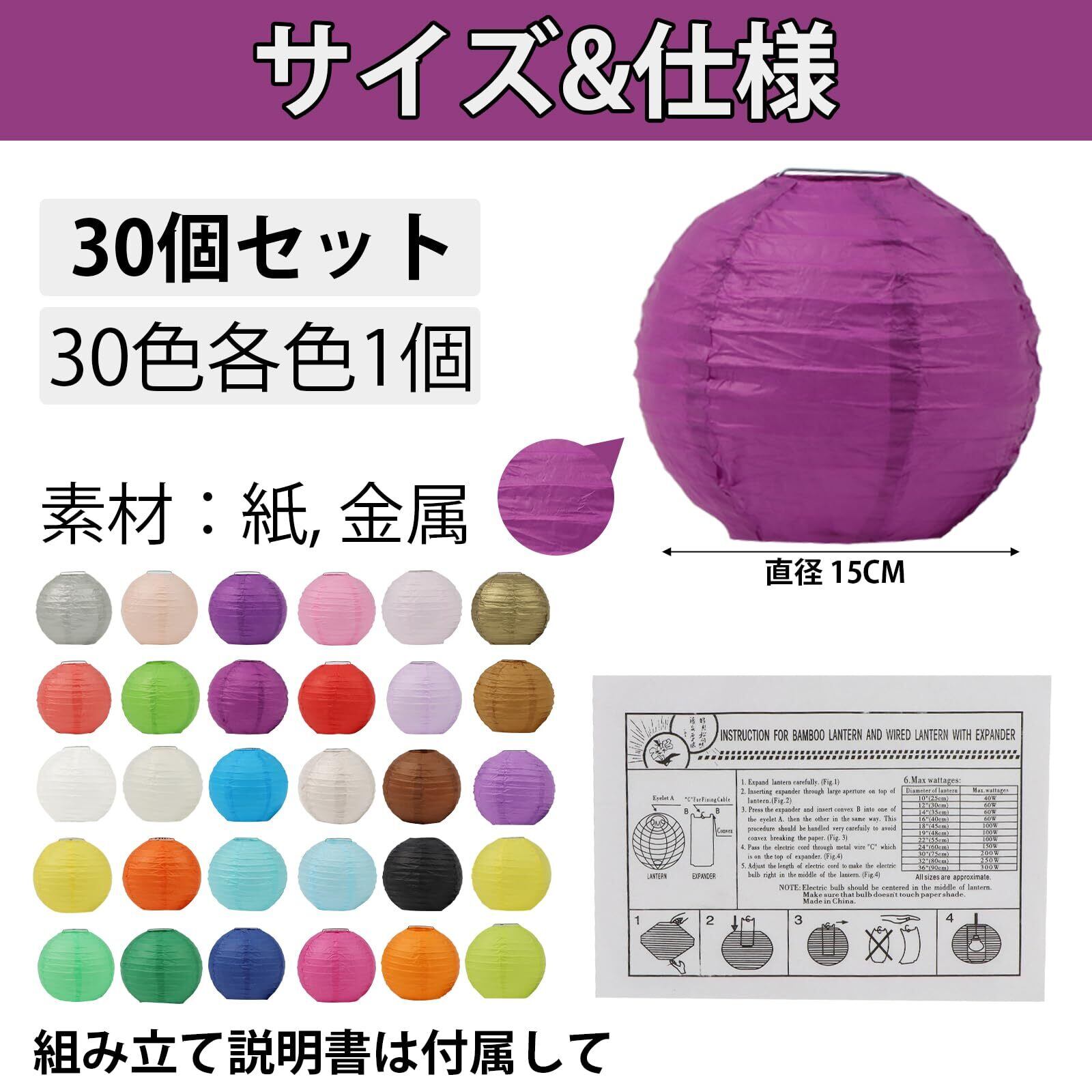 【仕 様】パッケージ内容:30色合計30個丸型紙提灯セット入り;サイズ:直径15cm、材質:落水紙・金属サポート。靭性と延展性に優れの提灯専用「落水紙」を採用して作られた 、高品質で長持ちします。
