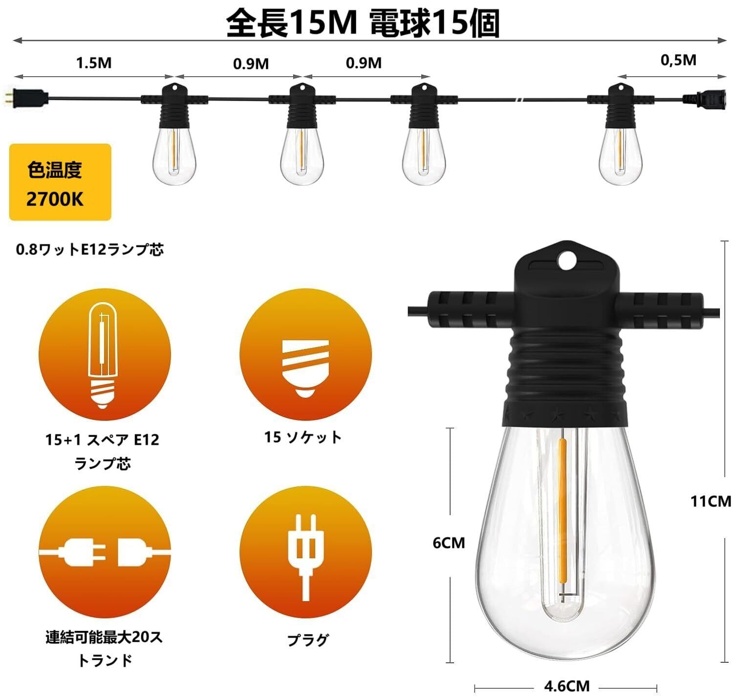 「商品仕様」ストリング長:15m、延長コード長:1.5m、ソケット間隔:0.9m、電球消費電力:1w 省エネ96%、定格電圧:AC100V 50/60Hz、電球全光束:100lm、色温度:2700k、ビーム角度:360º、電球数:15個+1個(付き)、ソケット個数:15個、重量:1.04kg