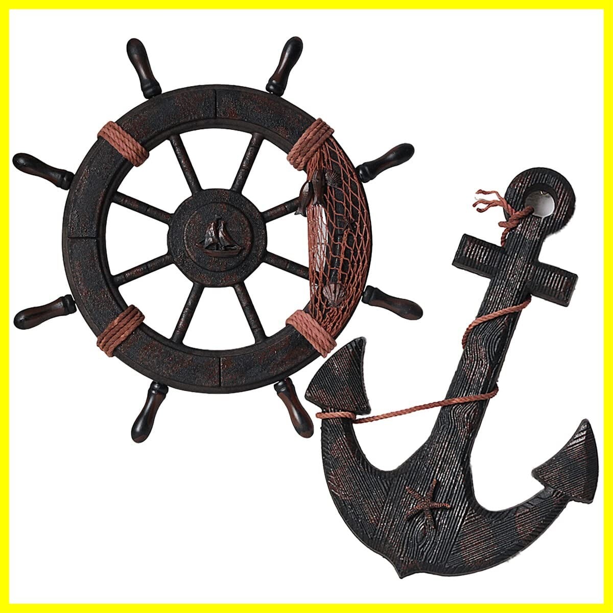 木製 舵輪 錨 アンティーク 海賊 インテリア 御洒落 船 オブジェ レトロ 舟 樽 ガーデニング アジアン テイスト 操舵手 アメリカン 浮き玉 オシャレ (L, 錨 舵輪 セット)