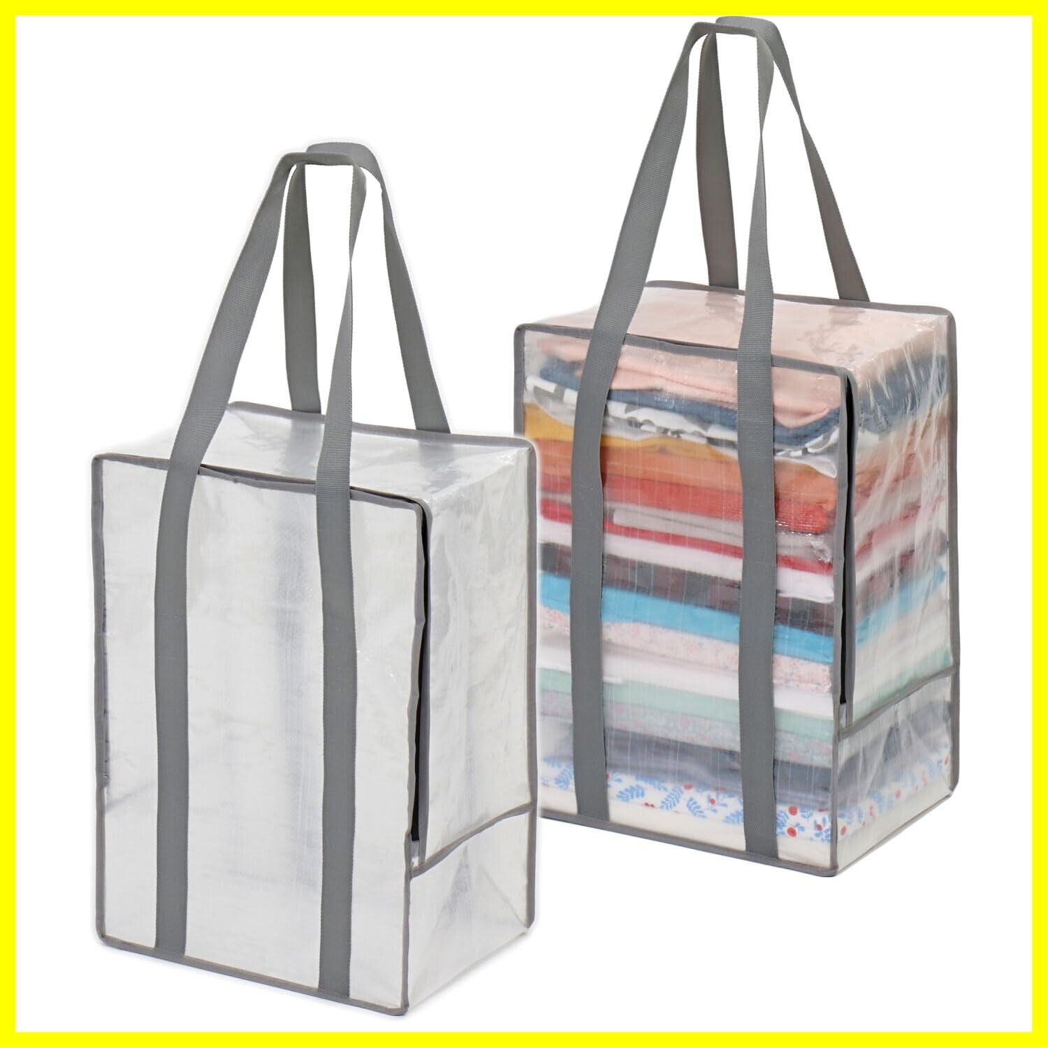 【商品仕様】:品番/112-12、サイズ/約幅35×奥行25×高さ50cm、カラー/クリア(半透明)、内容/2個、収納目安(1個あたり)/セーターやトレーナーなら約6~8枚・長袖シャツなら約24~28枚・タオルケットなら約2~3枚・ブランケットなら約4~5枚、材質/ポリエチレン