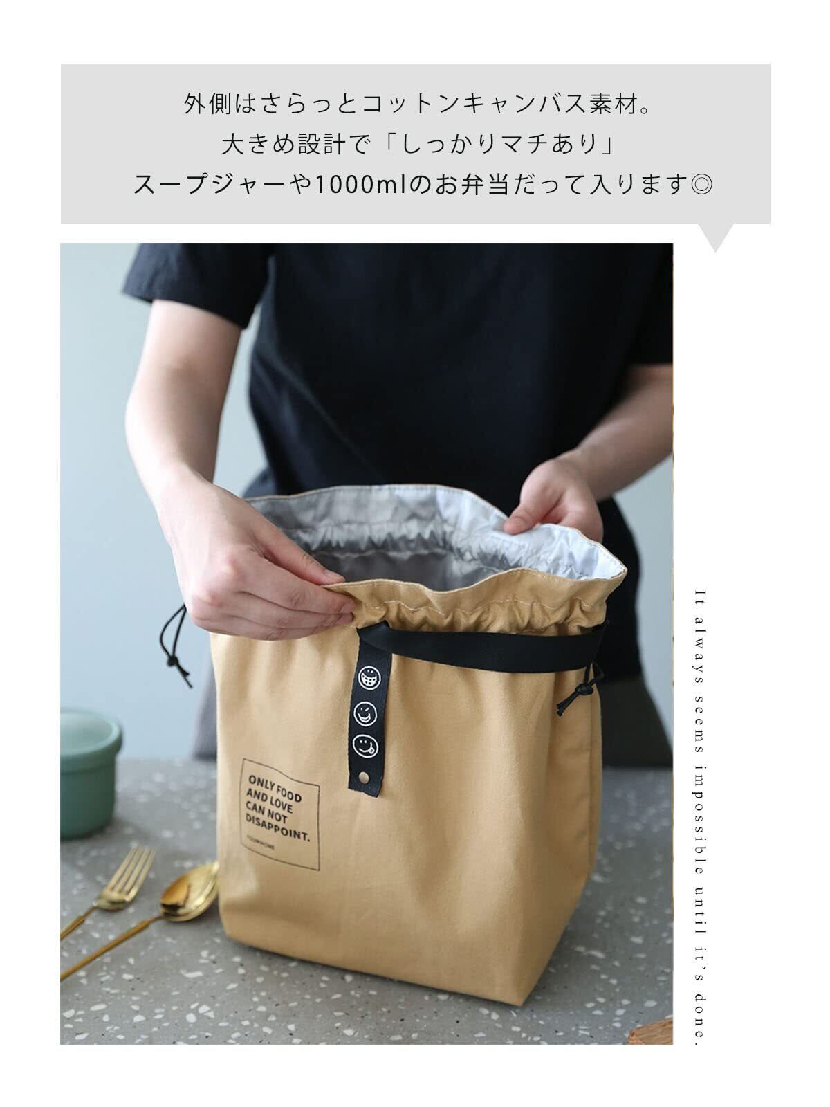 【保温・保冷】で安心のランチバッグ。 大きく開いて、とっても使いやすい巾着型。 バッグの中に入れるのはもちろん、 オシャレなシンプルデザインなので手持ちで使っても◎内側は保冷・保温のアルミ素材。 汚れてしまってもサッと拭き取れて衛生的です。 大きめ設定で「しっかりマチあり」 幅広マチなので、しっかり自立◎ スープジャーや1000mlのお弁当など見た目以上にたっぷり入ります。