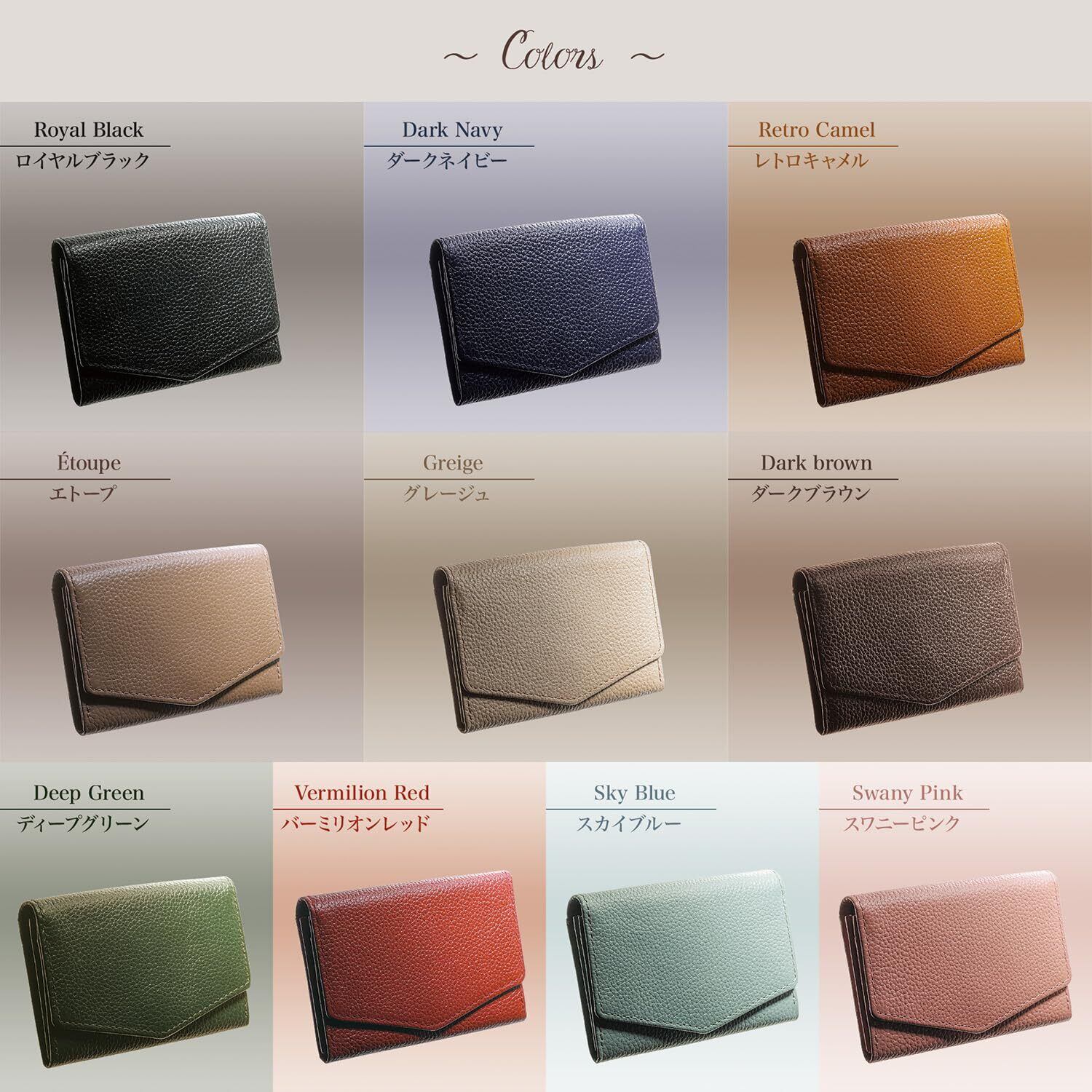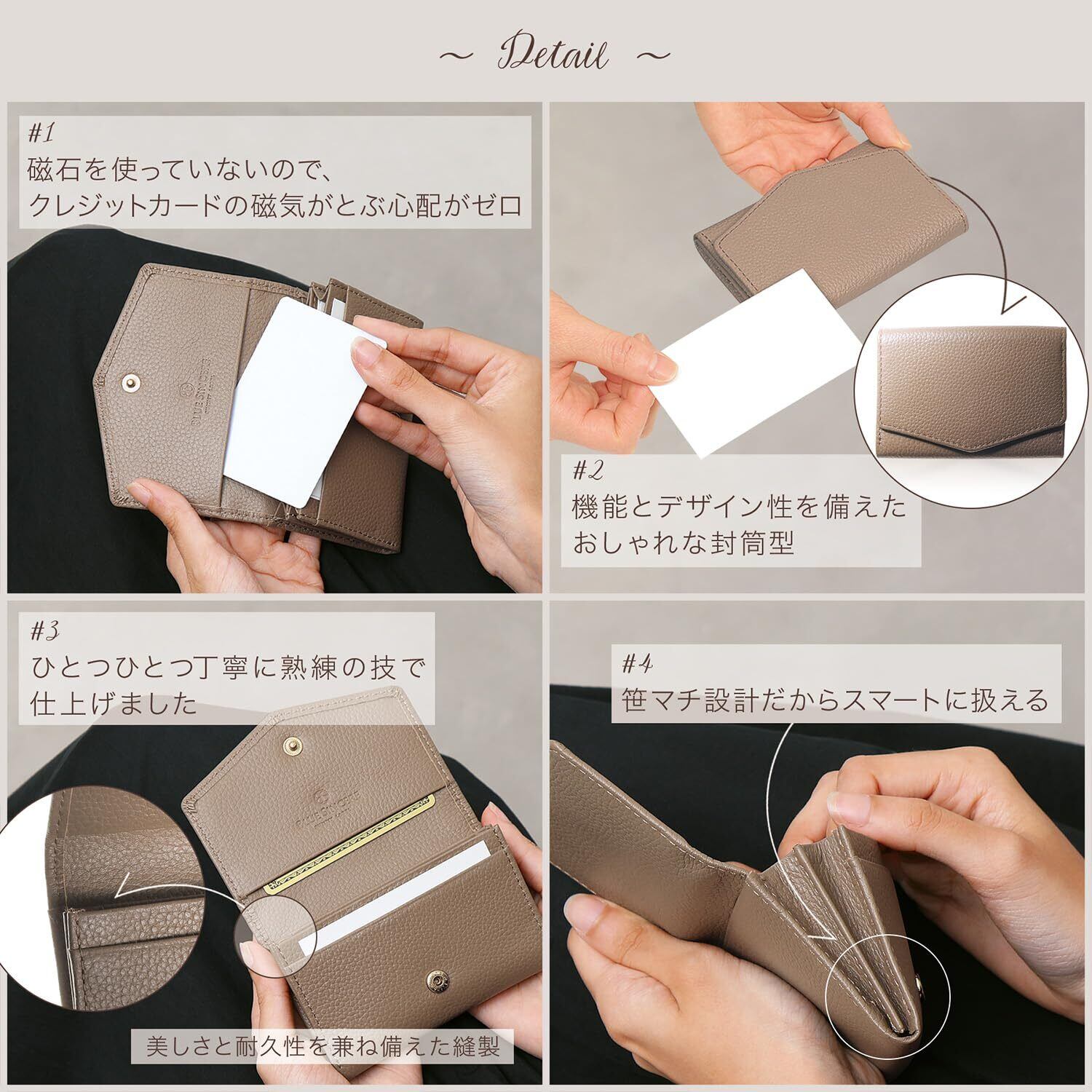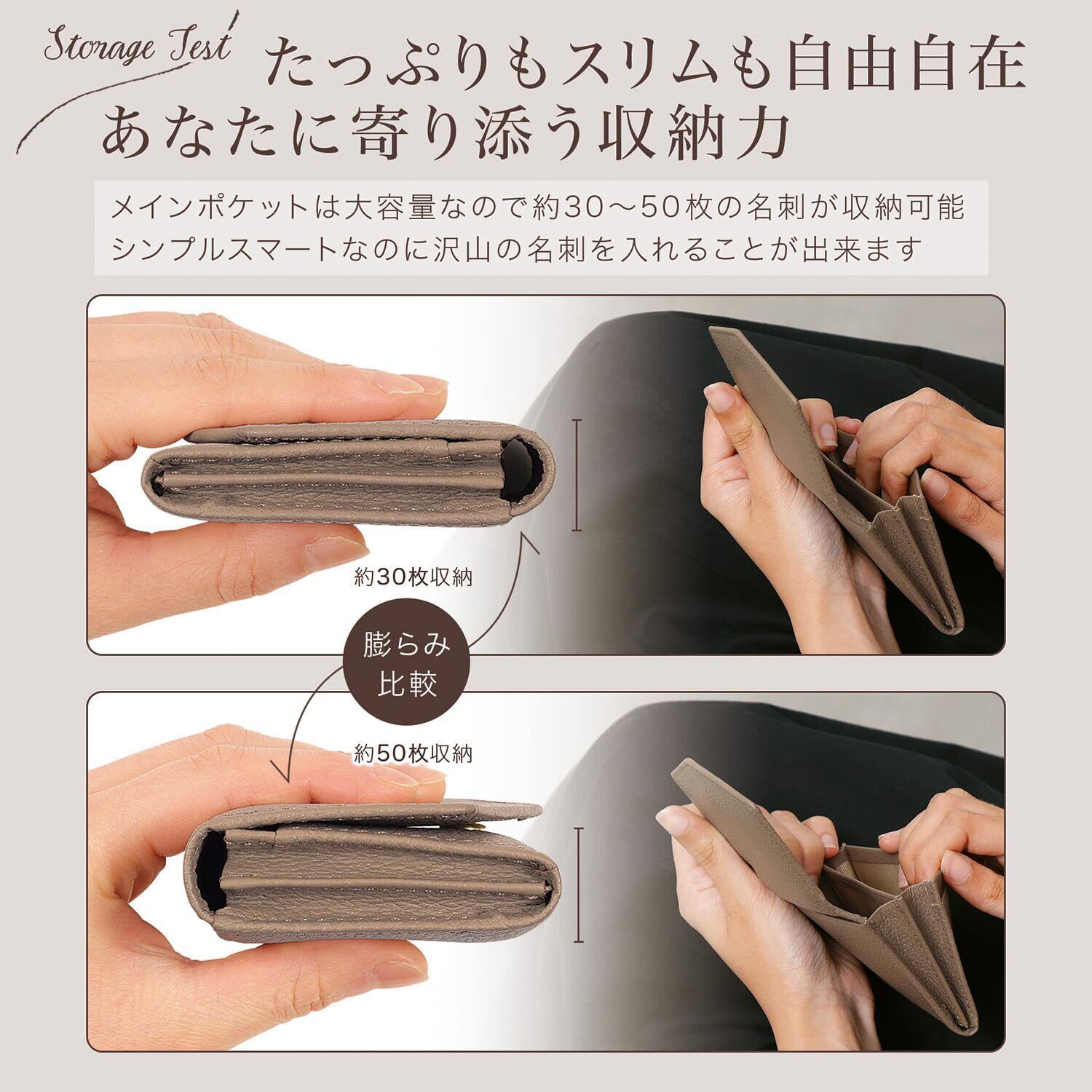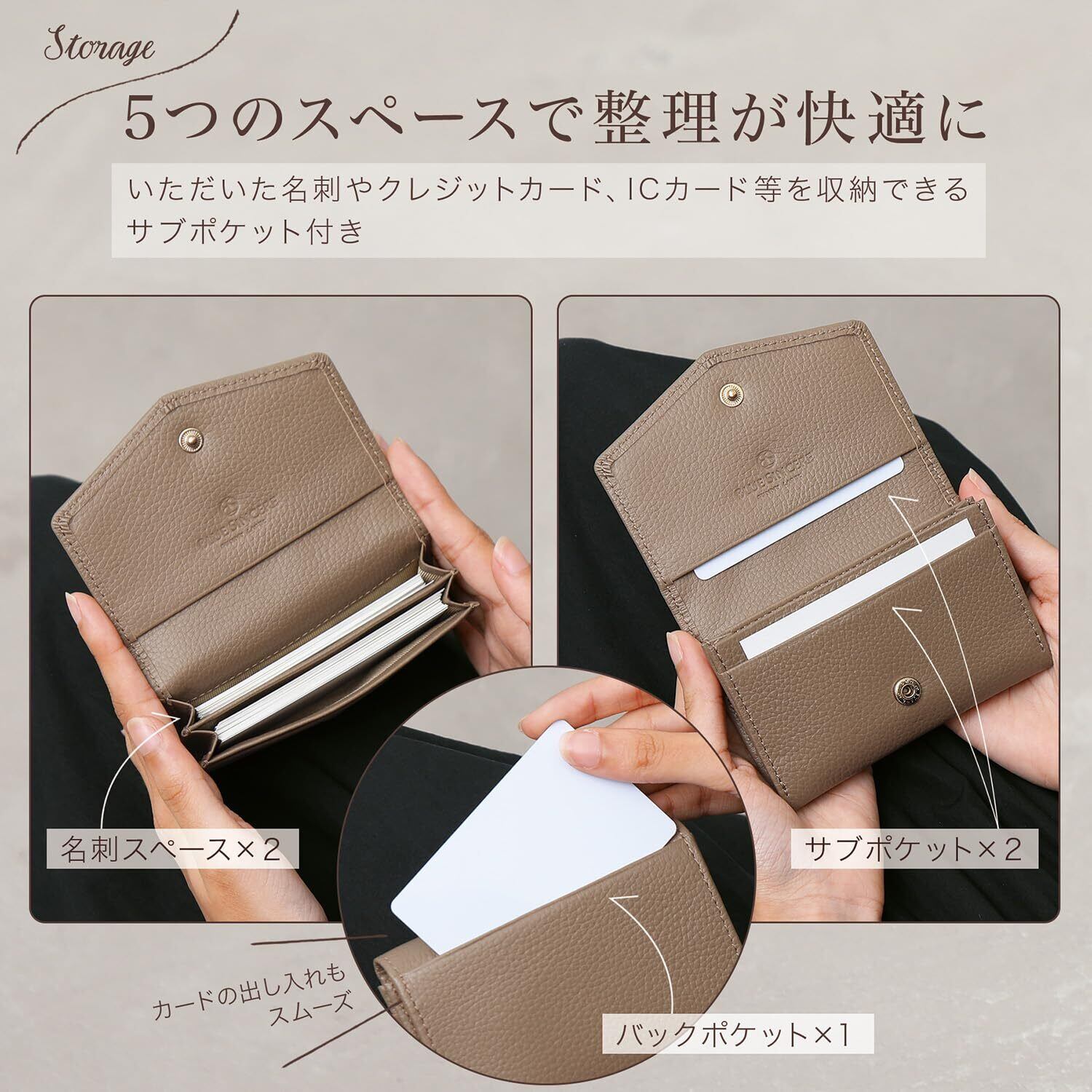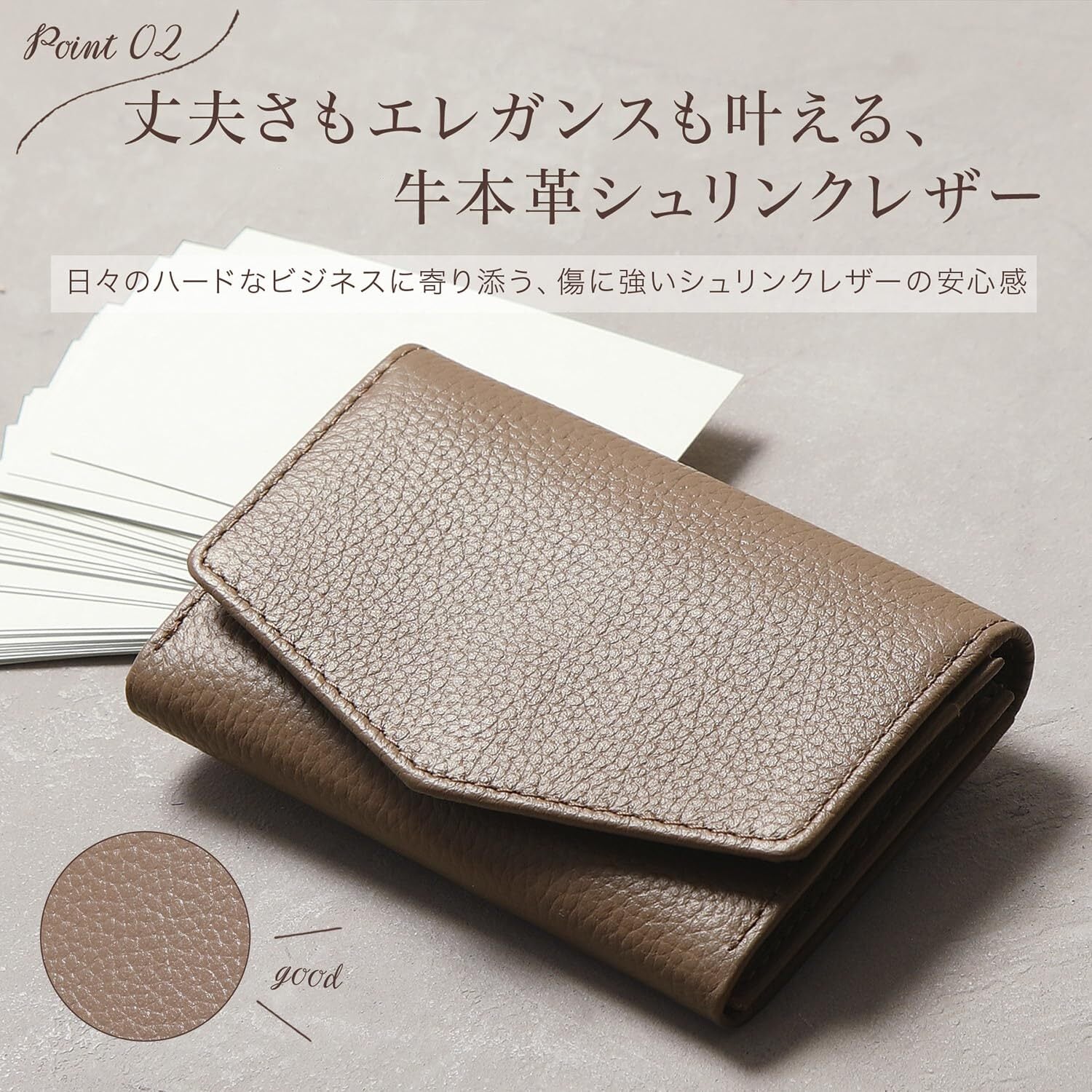 【こだわりの素材と機能性】厳選された上質なシュリンクレザーを使用し、しっとりと手に馴染む質感と高級感ある風合いを実現しました。見た目の美しさだけでなく、使い込むほど手に馴染む本革ならではの魅力をお楽しみいただけます。コンパクトなサイズ感ながら、名刺を40枚以上収納可能な大容量設計。 日常使いはもちろん、ビジネスシーンでもスマートに活躍する、機能性とデザイン性を兼ね備えたアイテムです。