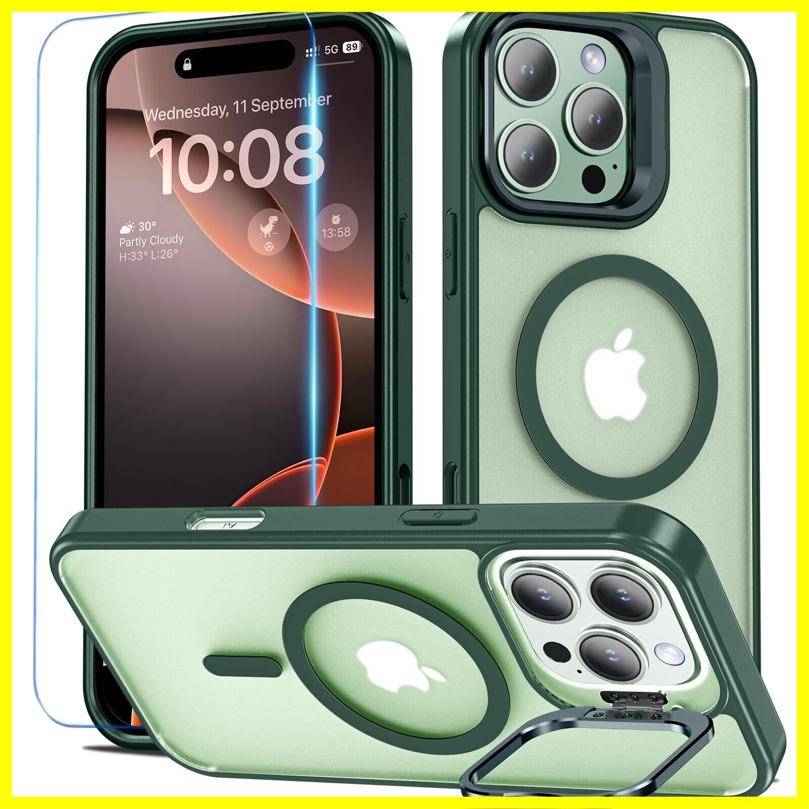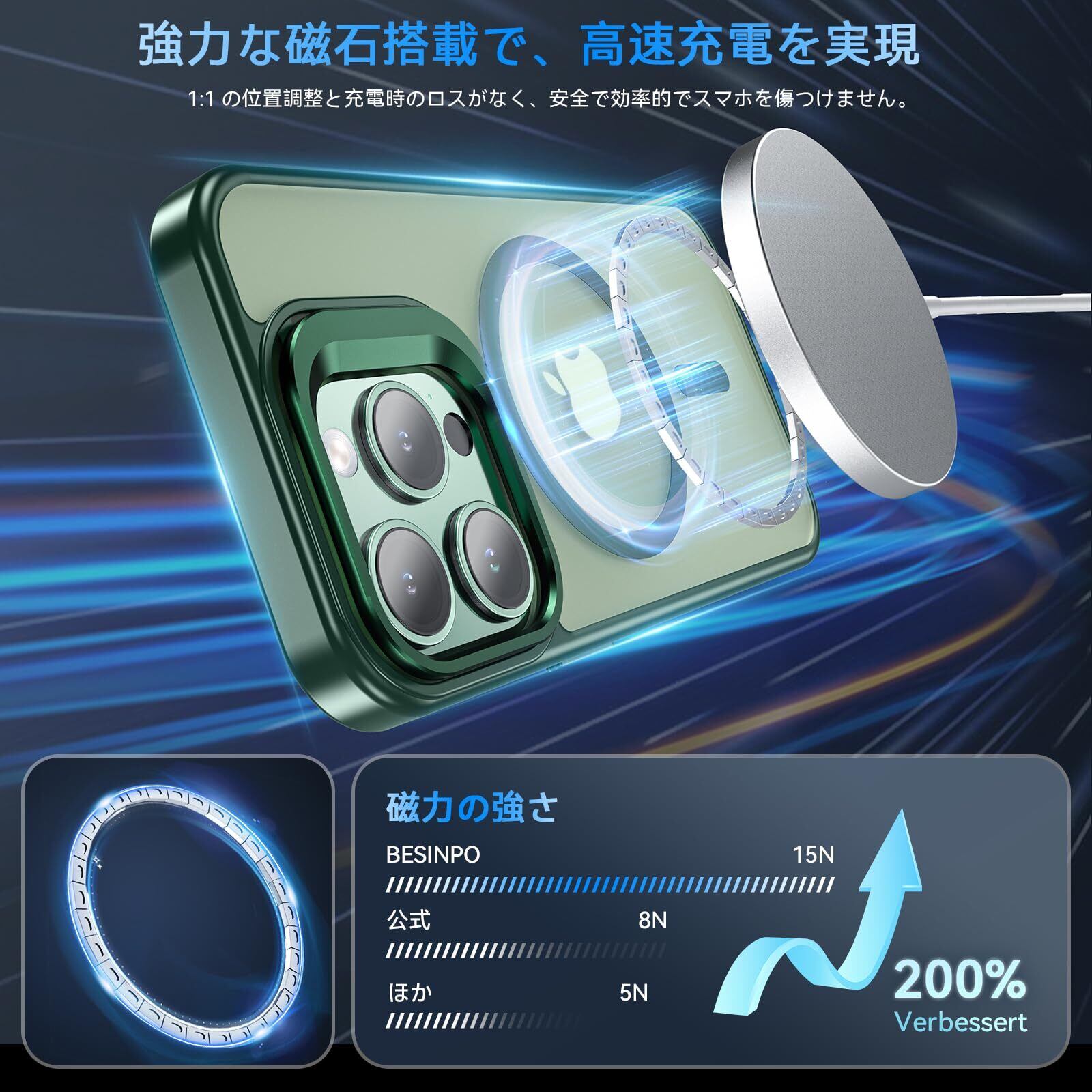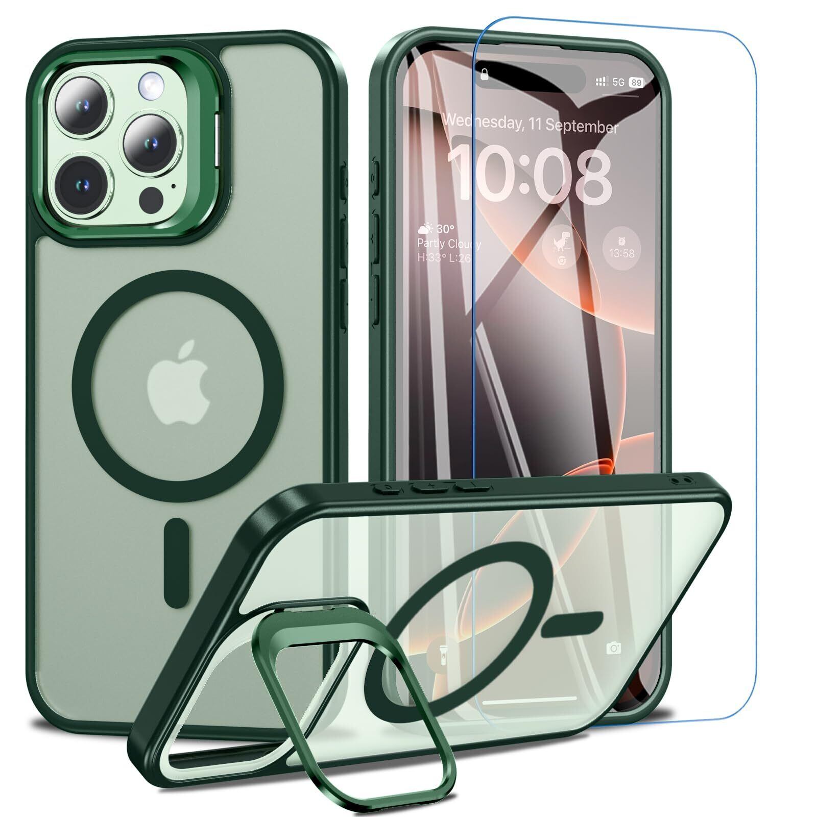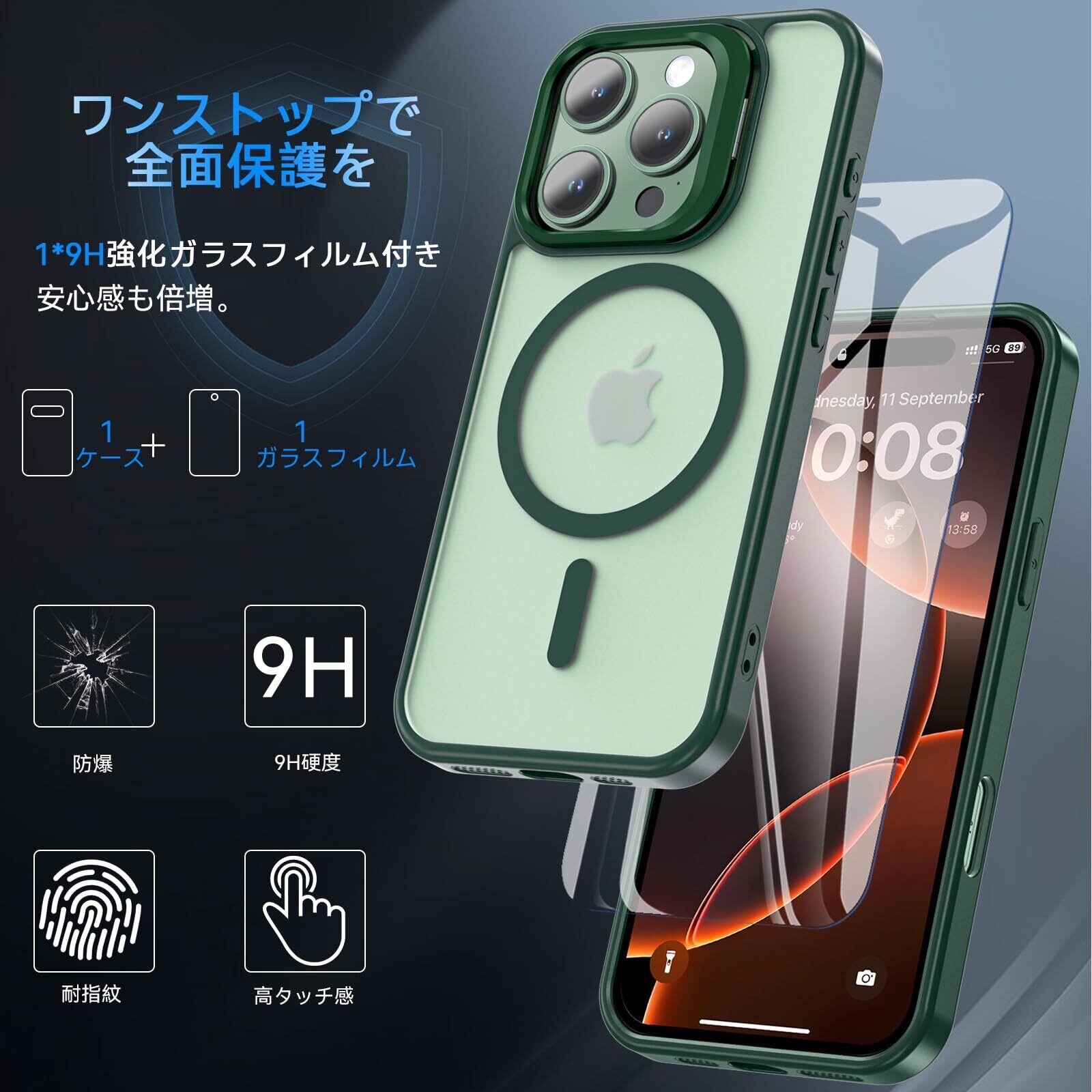 BESINPO iPhone 16 Pro Max ケース [ガラスフィルム付き・MagSafe対応・スタンド機能] アイフォン16プロマックス ケース 縦横両対応 調整可能 半透明 黄ばみなし 指紋防止 いphone16promax ケース 米軍規格 耐衝撃 耐久性 マグネット搭載 マグセーフ対応 ストラップホール iPhone 16 Pro Max ケース 6.9インチ対応 グリーン