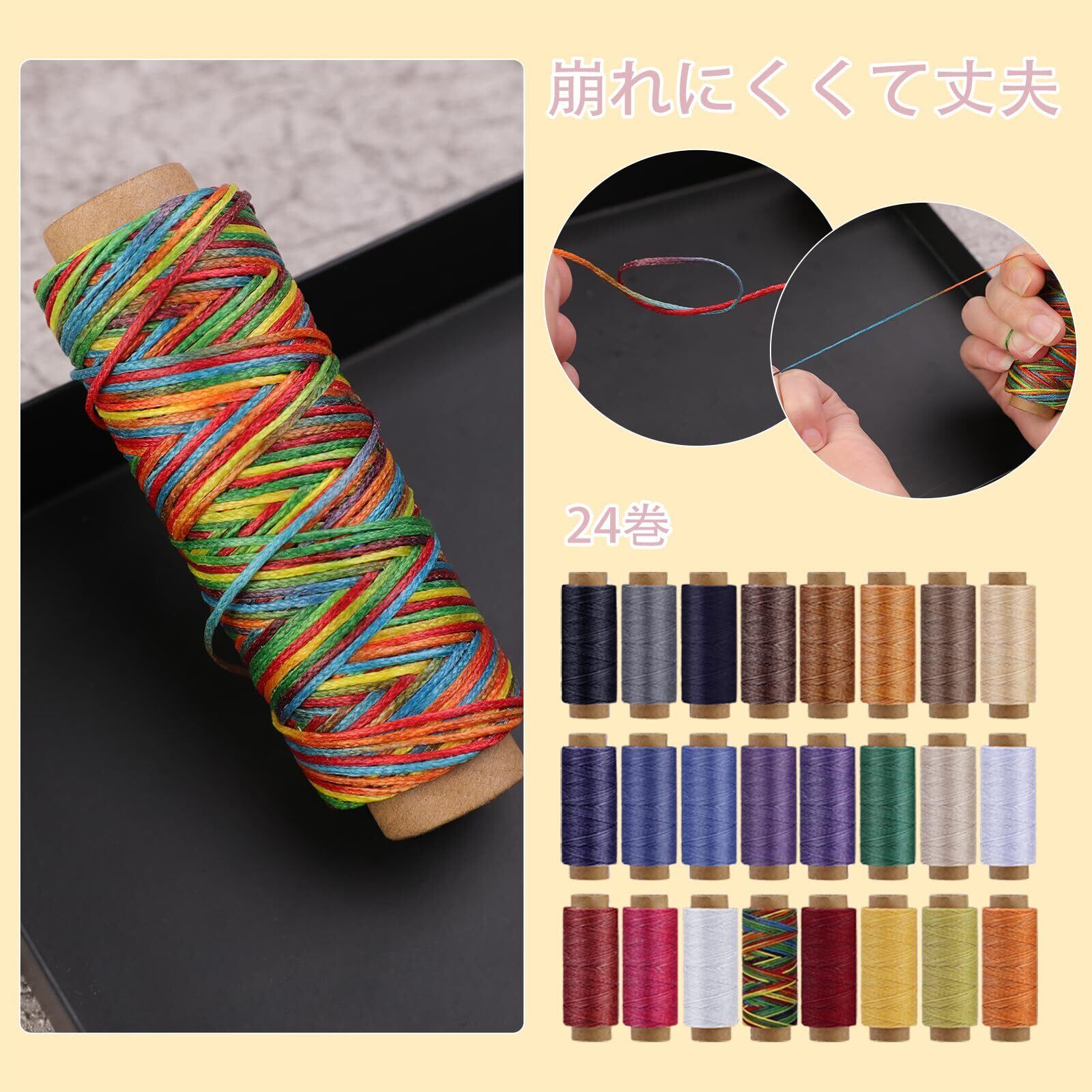 高品質なポリエステル:ロウ引き糸24色セット。暗めな色から明るい色まで幅広くお使い頂けます。