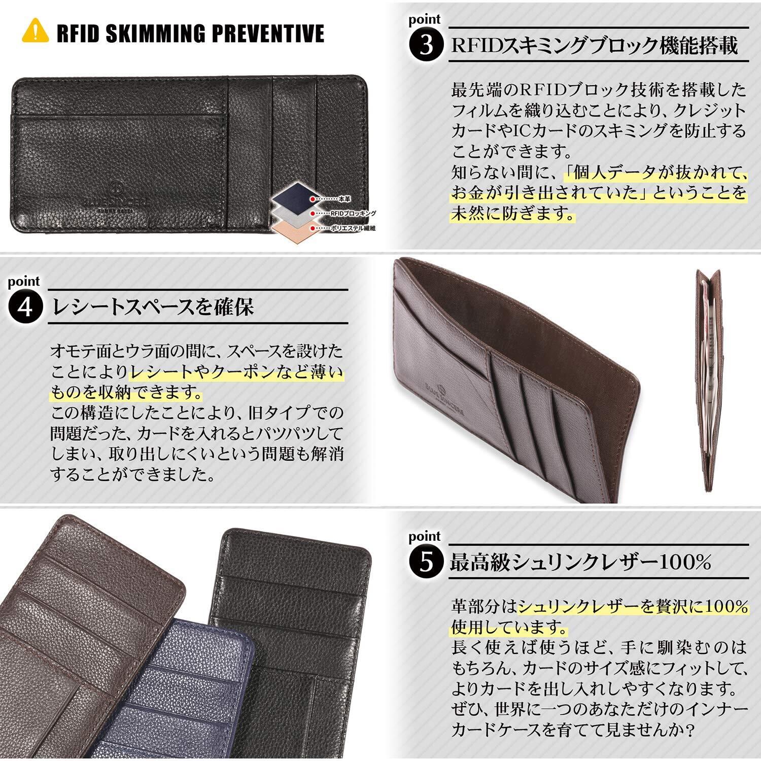 【 こんなお悩みありませんか? 】 「今使っている財布はデザインは気に入っているけど、カードの収納スペースが少ないから増やしたい…」「カードやレシートで財布がパンパンに膨らんでいる…」「カードのデータを守りたい…」こんなお悩みありませんか?一つのカードポケットにカードを複数入れて財布がパンパンになっていませんか?カードがスッキリ収納できていなくて、レジ前でカードを必死に探していませんか?今の時代、自分の個人情報は自分で守りませんか?これらのお悩みはBLUE SINCEREのインナーカードケースで解決できます。これであなたのお財布もスッキリします。 【 お客様のお声から誕生しました 】 「もう少しカード収納が欲しい…」「インナーカードケース自体が膨らむのがイヤ…」そんなお客様からのお声を聞き、収納だけでなく使いやすさも徹底追及したインナーカードケースが誕生しました。カードの収納枚数は、バランスの良さを考えて9枚にしました。必要なカードがパッと見えて分かりやすい構造なので、レジ前でもサッと見つけられます。また、カード同士が重なりにくい3方向構造にしたので、カードケース自体の膨らみも抑えました。それだけでなく、3方向からカードを出せるので、取り出しやすさも実現しました。これで財布の中身もスッキリでき、財布がパンパンになるということも無くなります。 【 レシートもスッキリ収納! 】 レシートや貰ったクーポン券などを財布に入れておくと財布の中がいっぱいになってしまいますよね。財布の中でレシートがぐちゃぐちゃになっていると、見た目も悪くなってしまいます。そんなレシートやクーポン券をスッキリまとめられるよう、レシートポケットを真ん中に付けました。ここにレシートやクーポン券を入れておくことでスッキリします。また、レシートだけでなくお札も入れられるので、これを財布代わりに持ってお出かけすることもできます。 【 長く使える本革素材 】 素材には最高級シュリンクレザーを贅沢に100%使用しています。長く使えば使うほどカードに馴染み、あなただけのインナーカードケースに育てられます。 【 セキュリティ面もバッチリです 】 キャッシュレス化が進み、現金を持ち歩かなくてもカードだけでお買い物ができる便利な時代になりました。ですが、犯罪の手口も多様化されて来ており、知らないうちにクレジットカードの情報を読み取られて悪用されてしまう、という犯罪も増えています。そんな恐ろしい犯罪からあなたの個人情報をしっかり守れるよう、カードケースの素材にはクレジットカードから発せられる電波を遮断できる「RFIDブロッキング専用フィルム」を織り込みました。インナーカードケースの中にクレジットカードを入れておけば、電波を遮断できるのでスキミングされ、「知らない間にクレジットカードを利用されていた。」ということを未然に防ぎます。スキミング防止機能の付いたインナーカードケースで、あなたの大切な個人情報をしっかり守ります。 【 サイズ 】 16㎝ × 7㎝ × 4㎜ 重量:33g 【 カラー 】 ロイヤルブラック・ダークブラウン・ダークネイビー