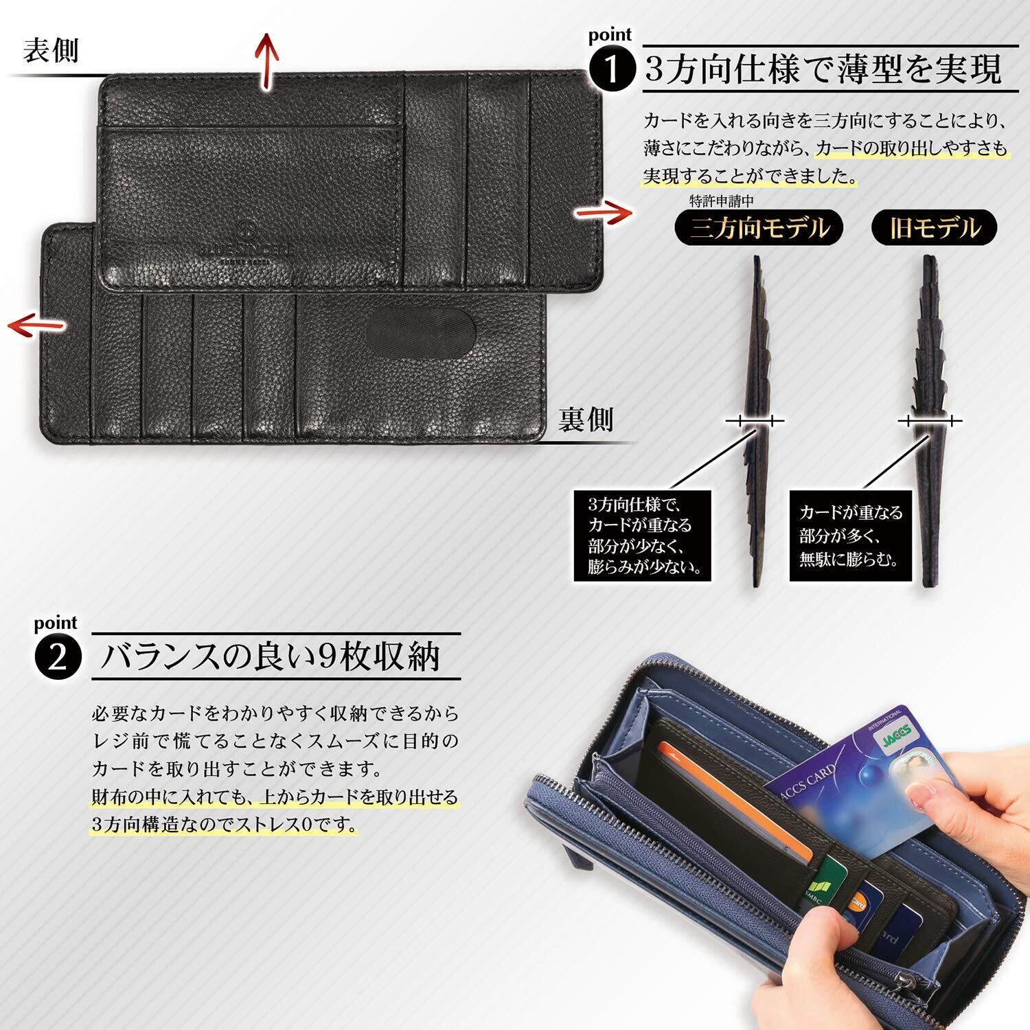 【 お客様のお声から誕生しました 】 「もう少しカード収納が欲しい…」「インナーカードケース自体が膨らむのがイヤ…」そんなお客様からのお声を聞き、収納だけでなく使いやすさも徹底追及したインナーカードケースが誕生しました。カードの収納枚数は、バランスの良さを考えて9枚にしました。必要なカードがパッと見えて分かりやすい構造なので、レジ前でもサッと見つけられます。また、カード同士が重なりにくい3方向構造にしたので、カードケース自体の膨らみも抑えました。それだけでなく、3方向からカードを出せるので、取り出しやすさも実現しました。これで財布の中身もスッキリでき、財布がパンパンになるということも無くなります。 .