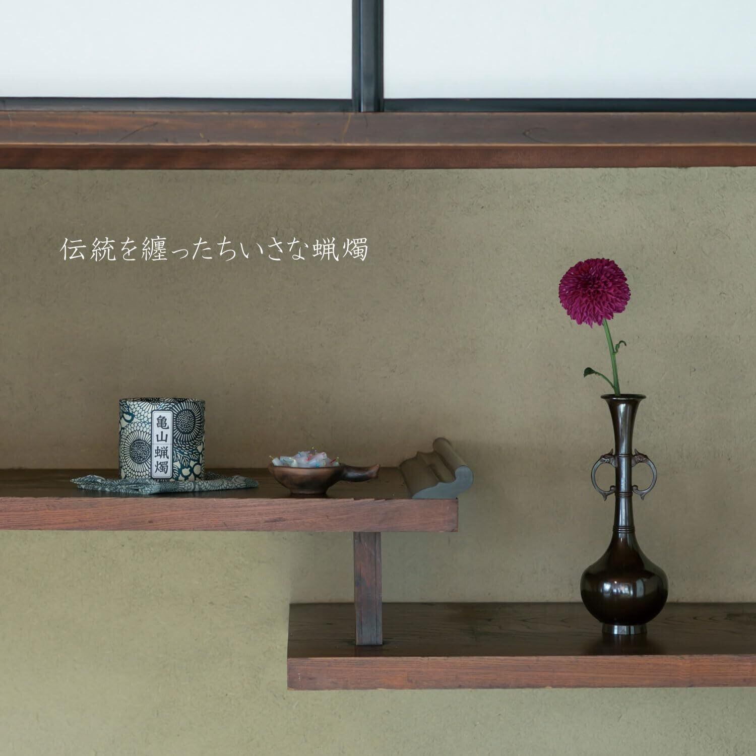亀山五色蝋燭は、京都の紙筒容器の老舗「鈴木松風堂」との共同開発の末、誕生しました。着物の伝統的な柄である「菊唐草模様」がおりなす藍色の陰影が美しく、京都の伝統に育まれた華やかさと上品さがただようデザインとなりました。
