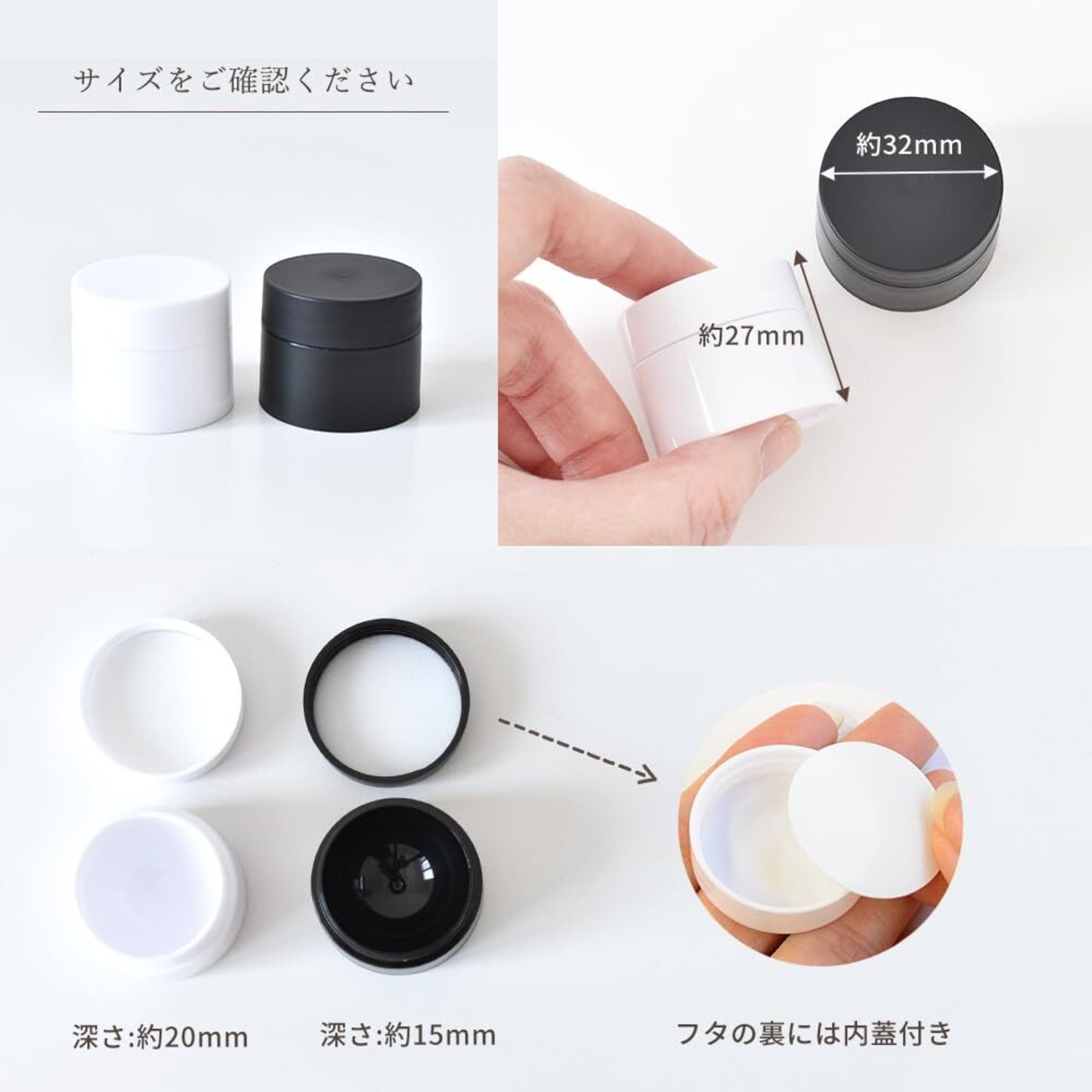 ■サイズ :【フタを締めた状態】 直径:約32mm 高さ:約27mm 深さ:【ホワイト】約20mm 【ブラック】約15mm ※ホワイトとブラックでは深さが異なります。