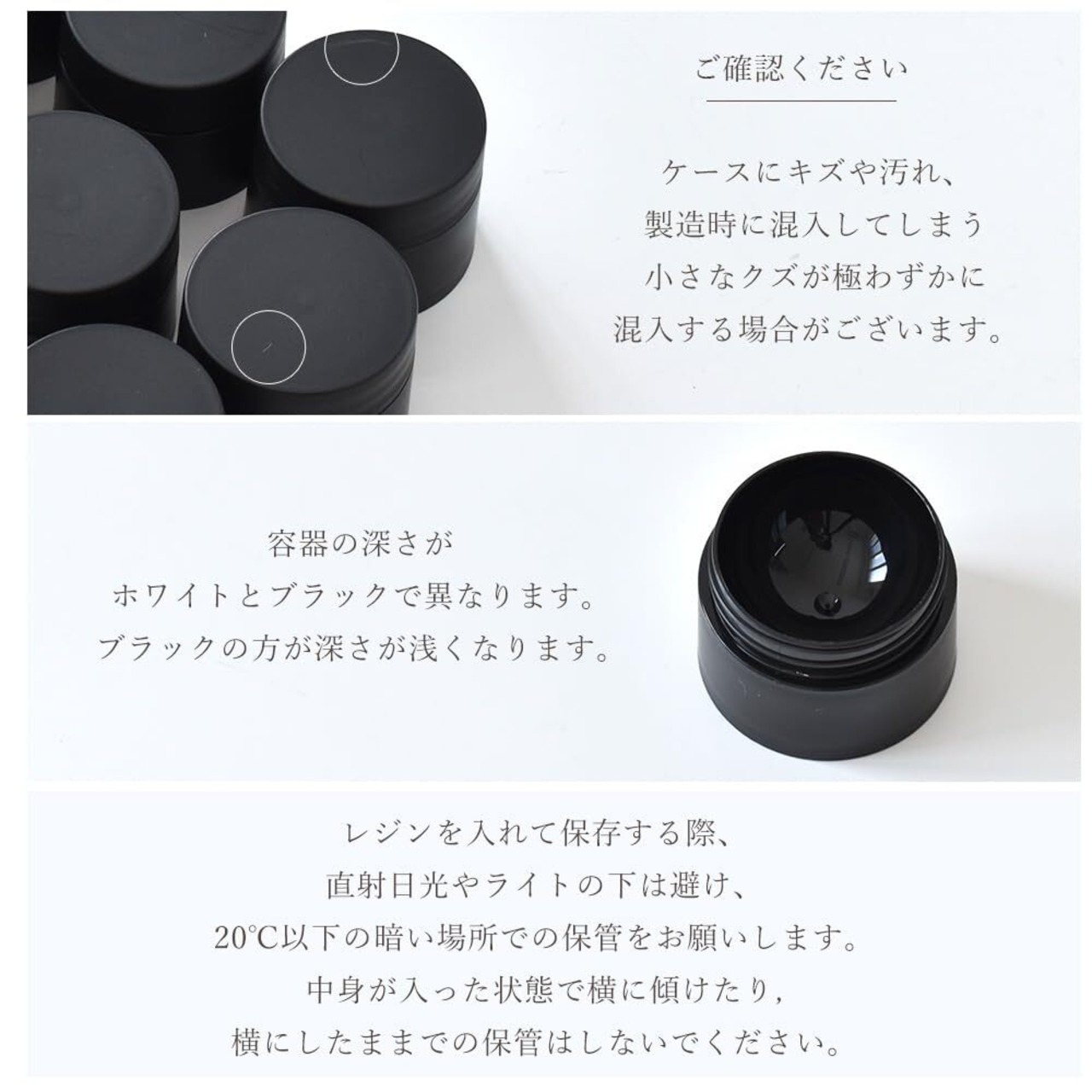 ■ご注意:・ホワイトとブラックでは容器の深さが異なります ・ケースにキズや汚れ、製造時に混入していまう小さなクズが極わずかに混入する場合がございます。 ・レジンを入れて保存する際、直射日光やライトの下は避け、20℃以下の暗い場所での保管をお願いします。 ・中身が入った状態で横に傾けたり,横にしたままでの保管はしないでください。
