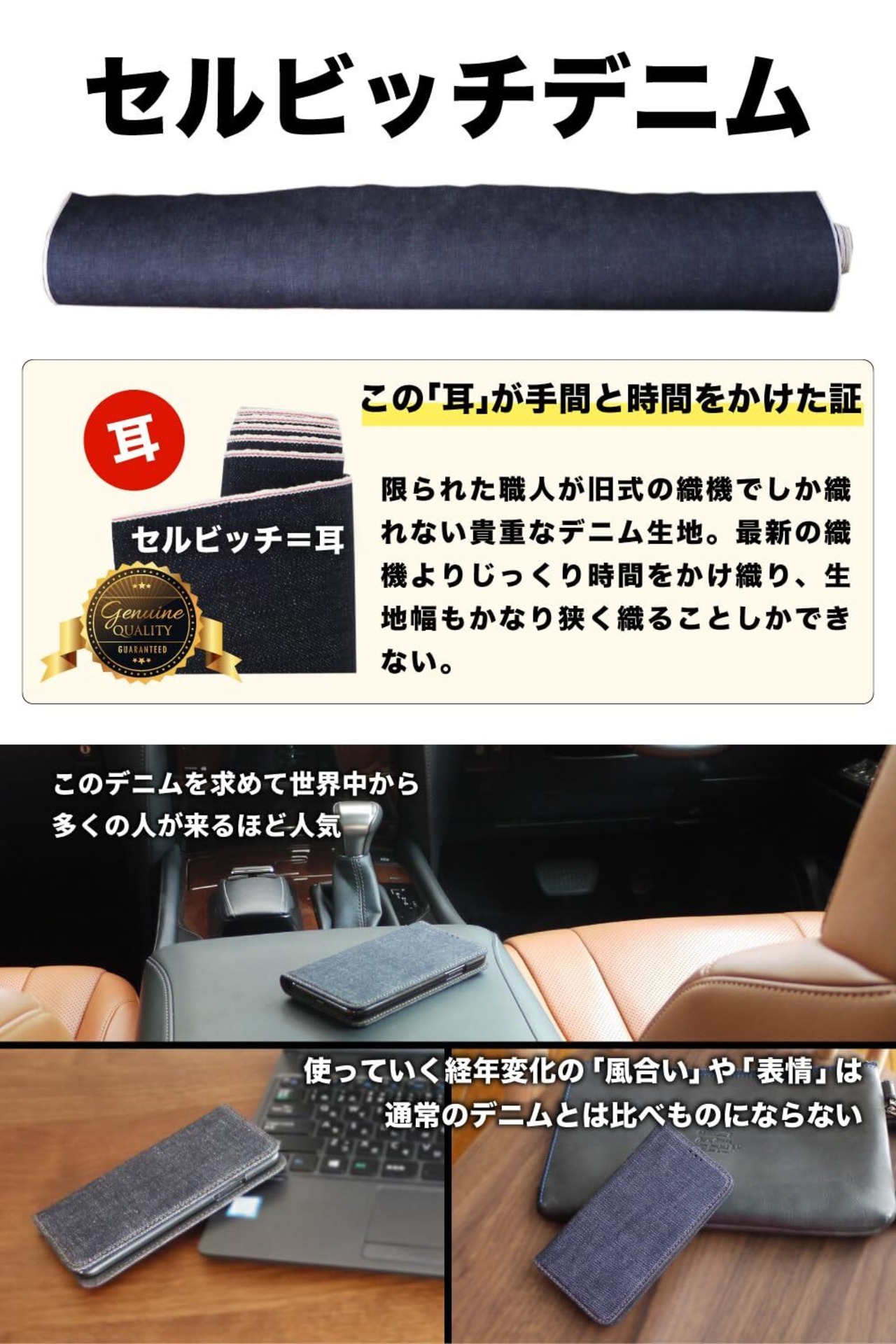 「セルビッチデニム」といえば、ミミ(セルビッチ=耳)。このデニムは、ヴィンテージデニム感が高いことも嬉しいポイント。ヴィンテージの王様的存在でジーンズの醍醐味を言われる「色落ち」の風合いや表情は一般的なデニム生地とは比べものにならない。。摩擦でデニムが最高の色落ちをして自分だけのオンリーワンアイテムに育つのも魅力のひとつ。通常ありがちなチープ素材のスマホケースは使い込むと使用感がハンパなくすぐボロボロなりますが、当商品は、デニム素材のスレ感で逆に味が出て愛着がUP。とく使用する「セルビッチデニム」の経年変化の風合いはよくあるデニム素材とはモノが違う。