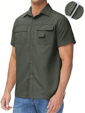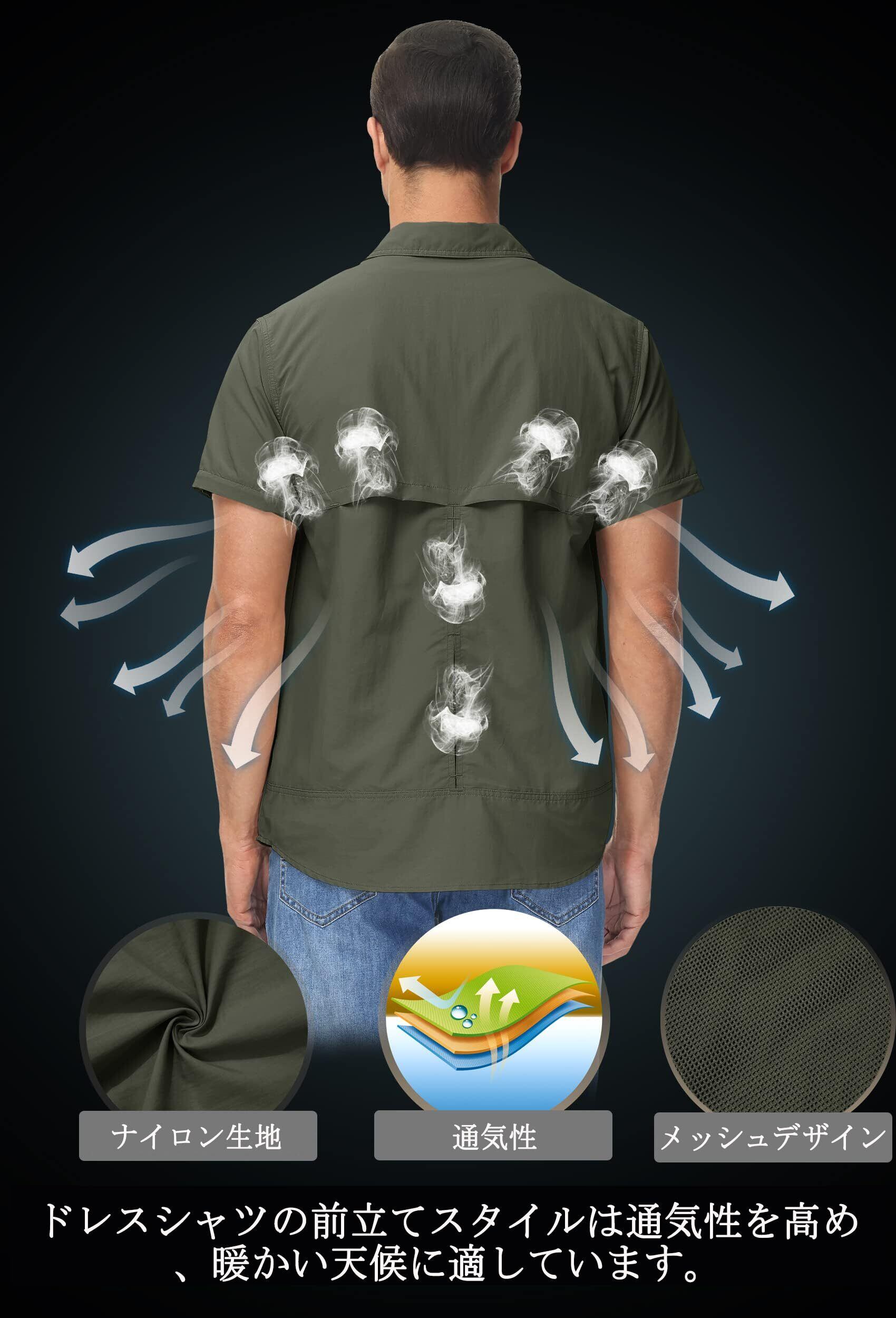 【背面メッシュ&胸ポケットデザイン】メッシュデザインの背面は、暖かい気候向けに通気性を向上させ、ドレスシャツスタイルのプラケット、胸の前には2つのボタン付きポケットと1つのペンポケットがあります
