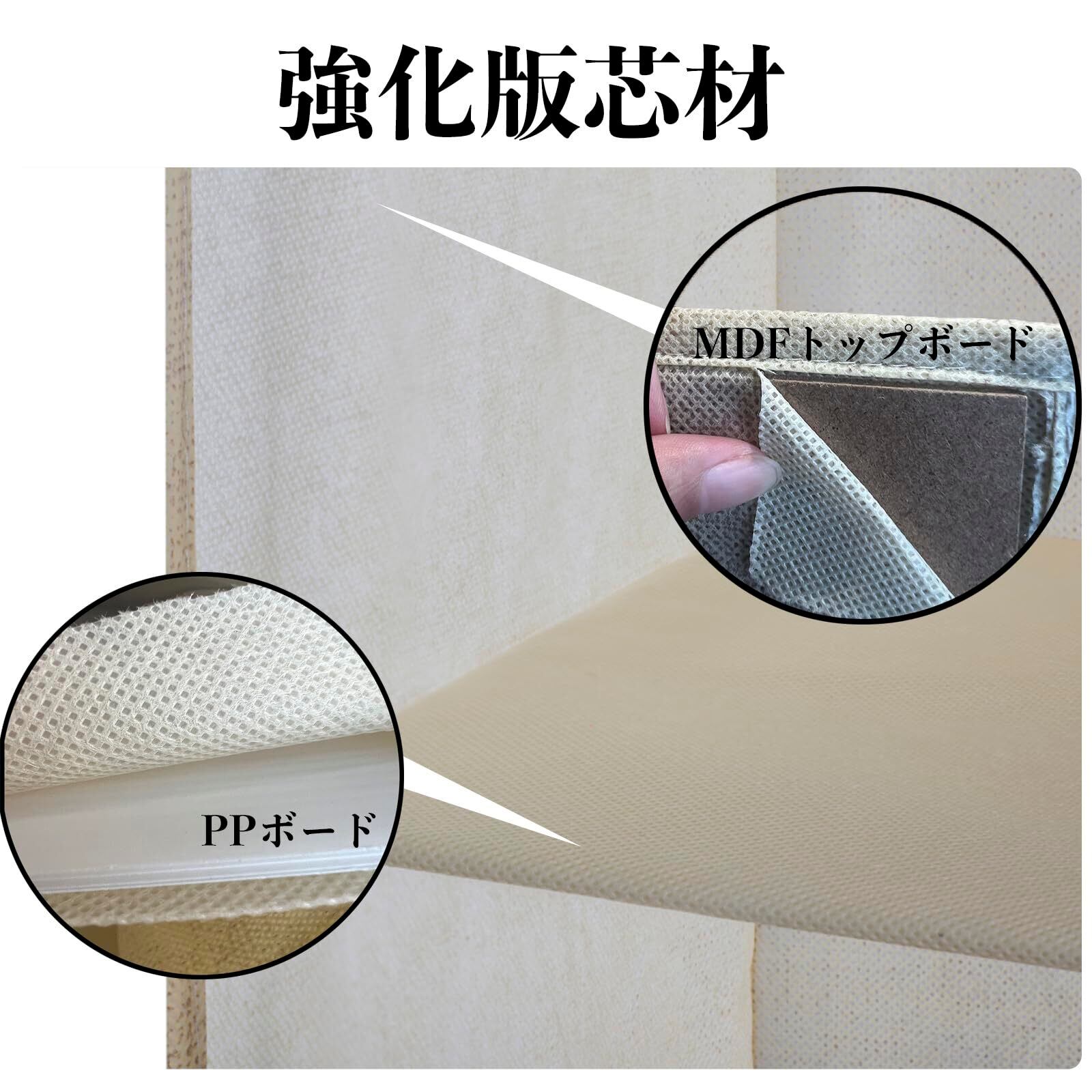 【強化版芯材】MDFトップボード入りなので、耐荷重も強いし、耐久力も強い。仕切り板にPPボードを採用し変形しないようになっている。