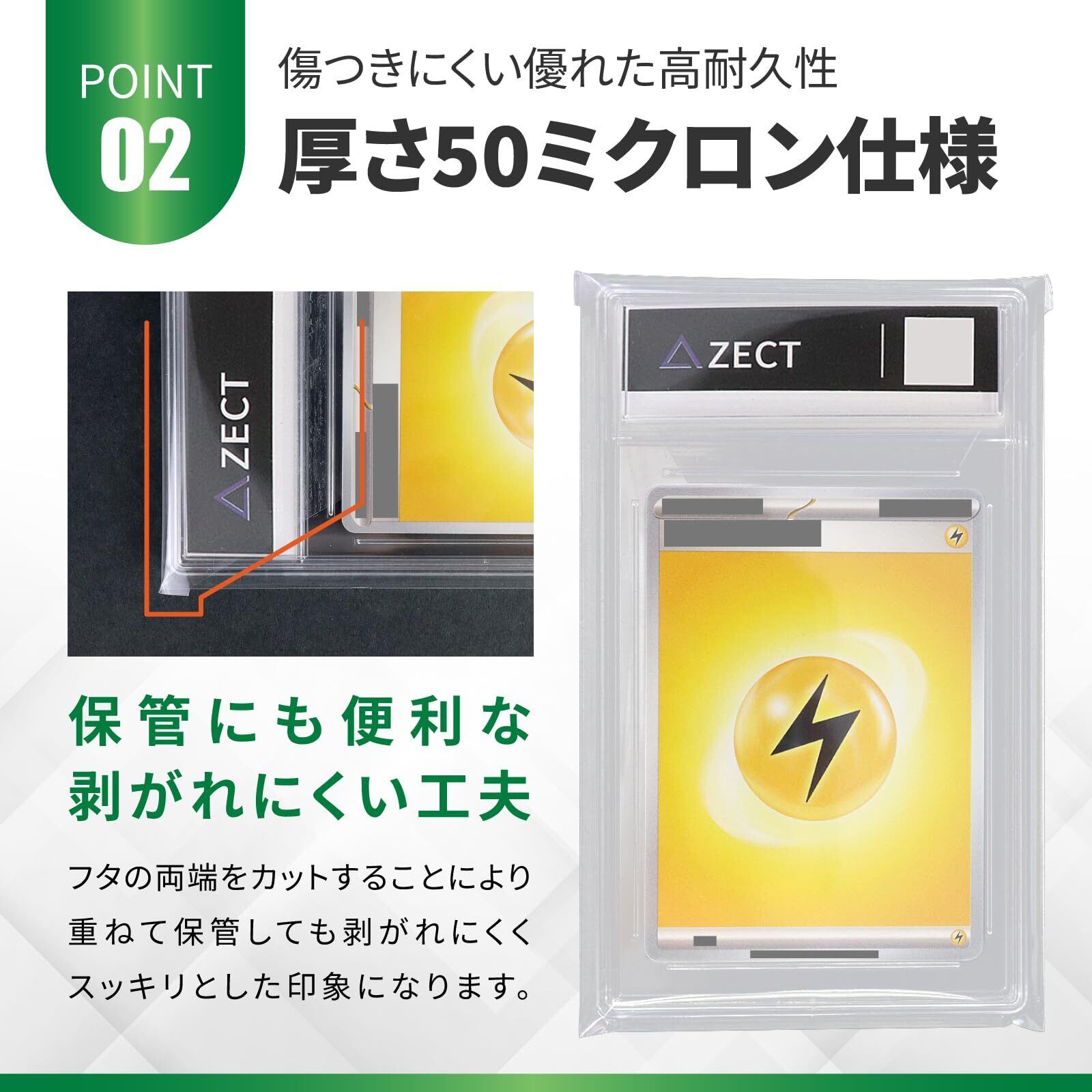 【厚さ50ミクロン仕様】スリーブは高耐久で傷つきにくい素材を採用しています。カードの裏面にかからない長さに調節されたフタ部分は、コーナーカットに仕上げることで剥がれにくくスッキリとした見映えで保管できます。