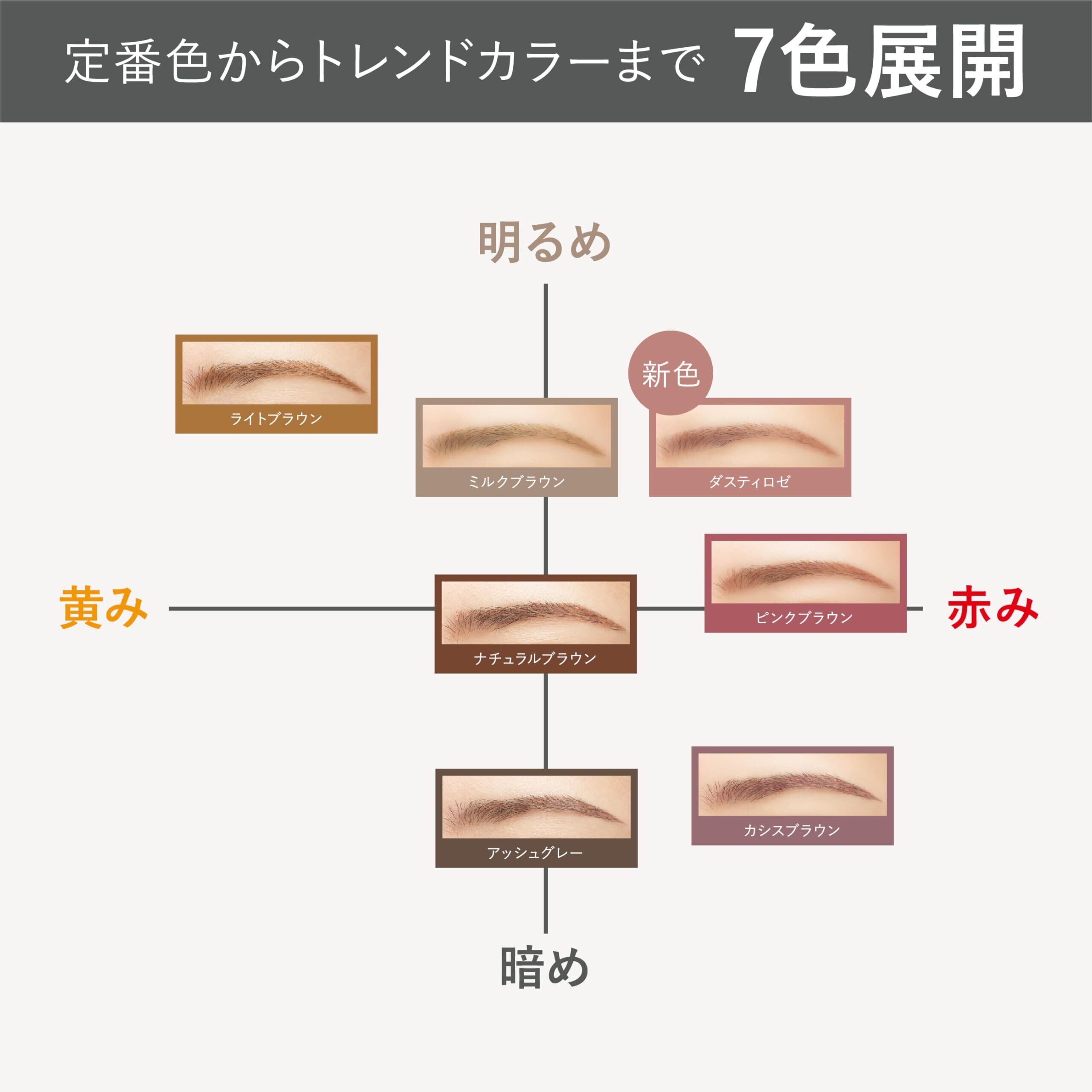 落ちにくいウォータープルーフ×スマッジプルーフ処方。 汗、水、皮脂に強い処方でふんわりキレイな眉を長時間キープ。
