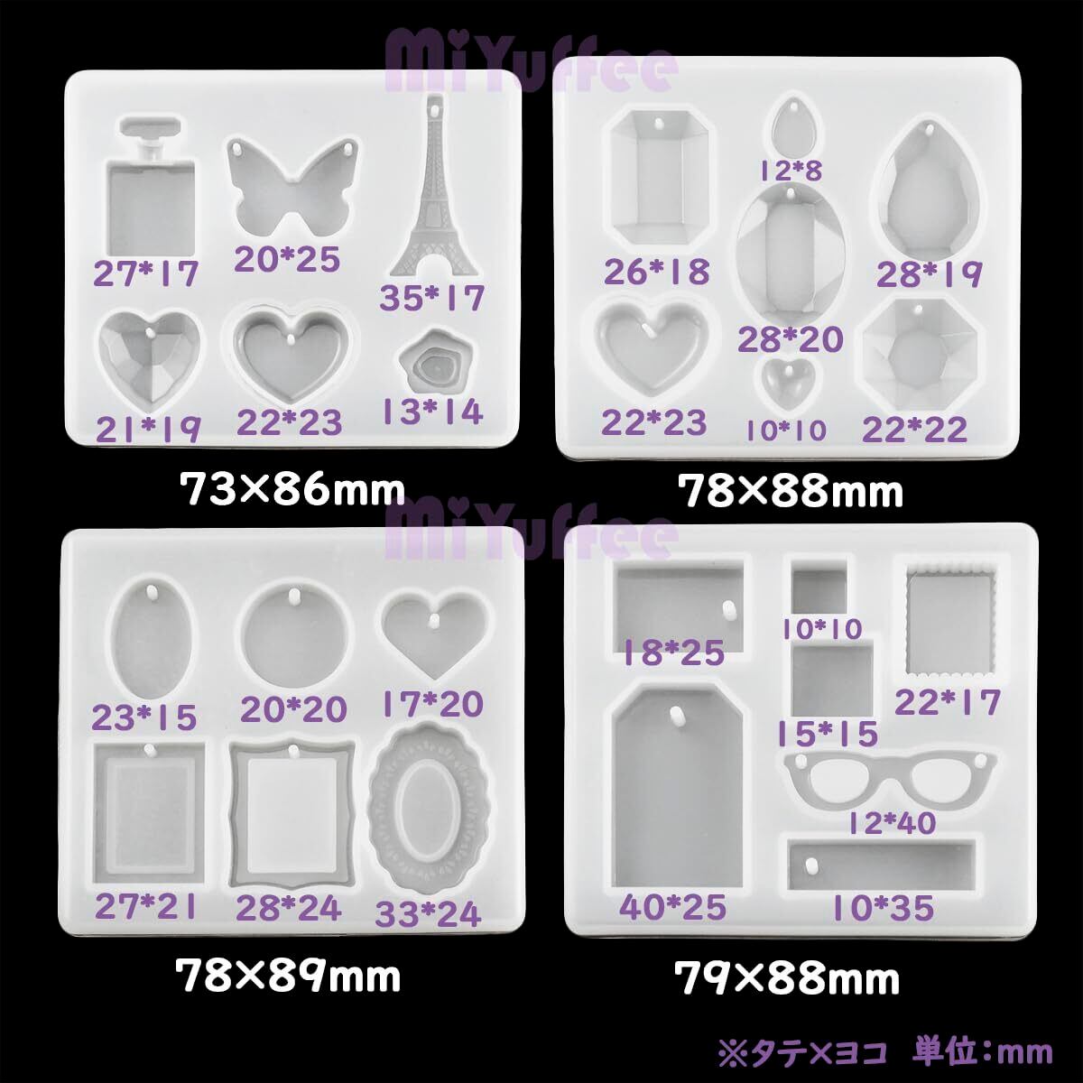 UVレジン、エポキシ樹脂、樹脂粘土などにご利用いただけるシリコンモールドです。ジュエリー・宝石・丸・ハート・フレーム・四角・タグ・メガネなど26種アクセサリーパーツの4個レジン型セットです。