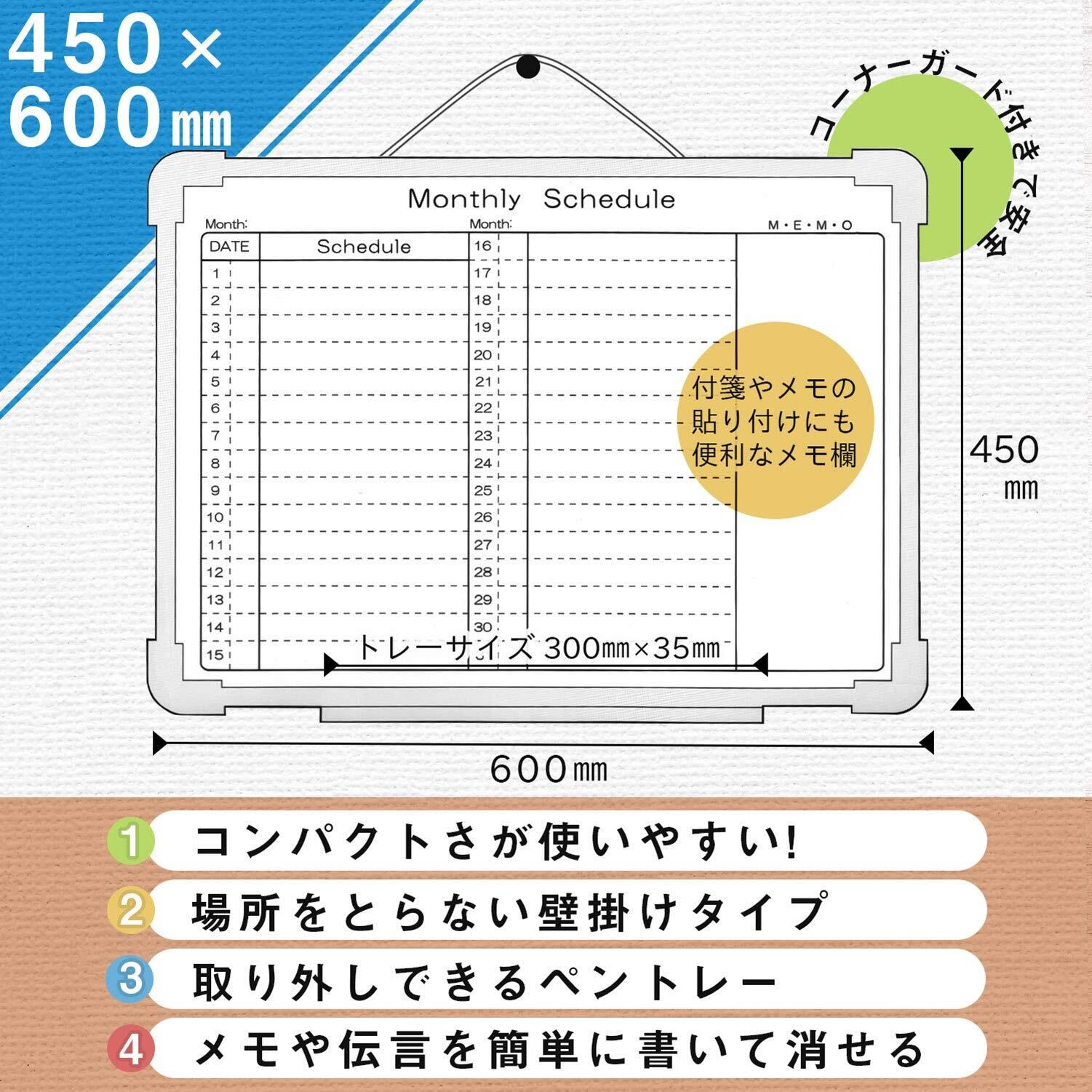 軽くて扱いやすい「幅600mm×高さ450mmサイズ」。スケジュール管理に便利なヨコ型月間予定表タイプの樹脂枠ホワイトボード。